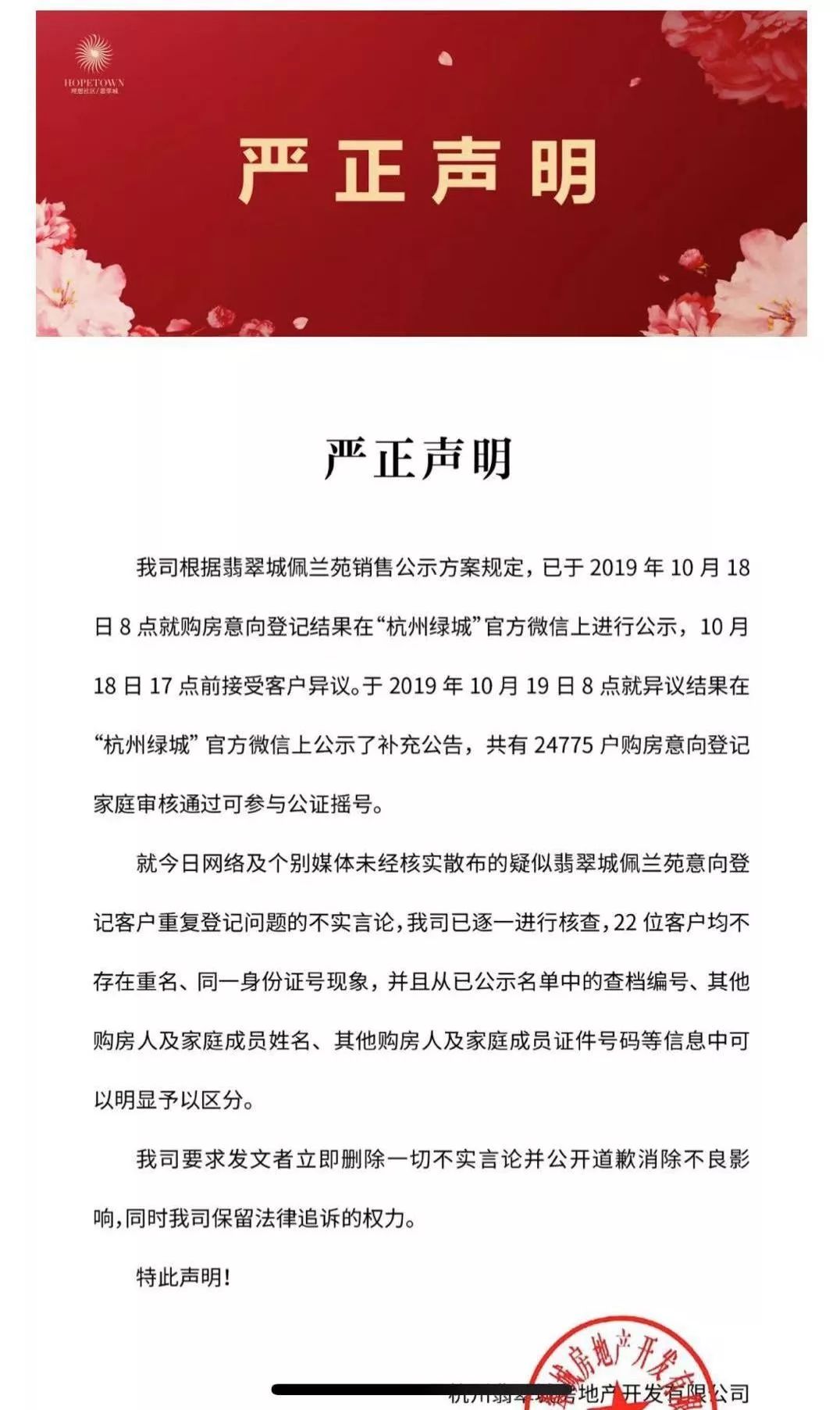 不过昨天傍晚,翡翠城开发商在“杭州绿城”微信公众号上发布了一则《严正声明》,声明中表示,绿城方面对登记名单逐一进行核查,“22位客户均不存在重名、同一身份证号现象,并且从已公示名单中的查档编号、其他购房人及家庭成员姓名、其他购房人及家庭成员证件号码等信息中可以明显予以区分。”