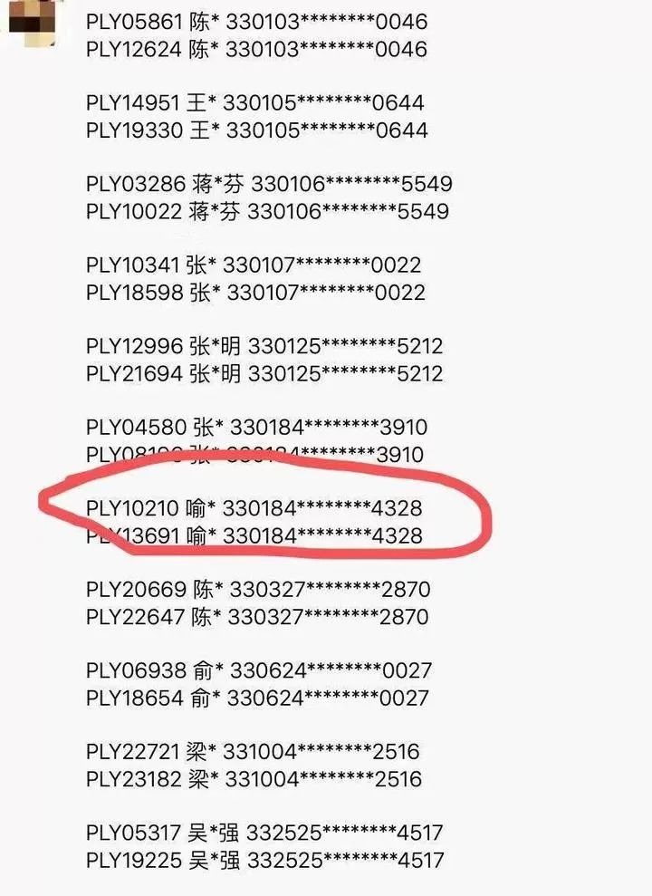 梧桐郡摇号名单中,还出现了如两位皆显示为“喻*”的购房者、身份证号码同为330184********4328的现象。像这种情况,很可能两位喻某是闲林同一个村的,甚至有一定的亲戚关系。