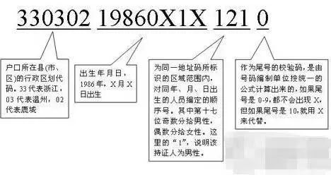 其中前6位是户籍码,代表户籍所在区域。具体来说,第1、2位,是所在省(自治区、直辖市)的代码,如上海的代码是31,江苏代码是32,浙江代码是33;第3、4位通常是地级市代码,如杭州的代码是01,宁波代码是02,温州代码是03;第5、6位通常是县(县级市、区)的代码;
