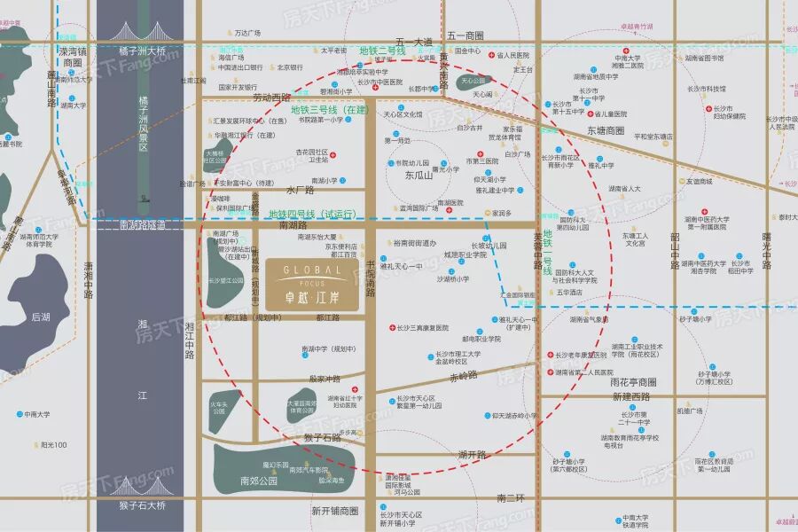 区位图 卓越江岸动态:卓越江岸预推3#建面35-50平公寓,主力户型35平,包括LOFT、平层、双钥匙三种物业类型,开盘时间待定。项目简介:卓越江岸,位于长沙天心区书院路。项目区位依托现有滨江开发的优势,附近建设有大量写字楼、酒店、住宅。商业上,地块所属的南湖商圈经济繁荣、人气旺盛,同时紧邻五一广场,黄兴路步行街、坡子街、太平街、解放西路酒吧街等核心商圈,岳麓山、湘江、橘子洲头、沿江风光带景色尽收眼底。交通上,卓越江岸项目与在建地铁四号线“碧沙湖站”相距约400米,出门可直达南湖路过江隧道,周边有101路、122路等近20条公交线路,便达长沙。教育上,项目四周环绕南湖小学(本案配套小学约900米),湖南省 师范附属小学、雅礼天心中学、南湖小学配套中学、雅礼中学。医疗上,湖南省儿童医院、中南大学湘雅附二、长沙市中医院、长沙市第三医院等紧邻项目,方便生活。环境上,项目紧邻湘江风光带、橘子洲头,可远眺岳麓山。