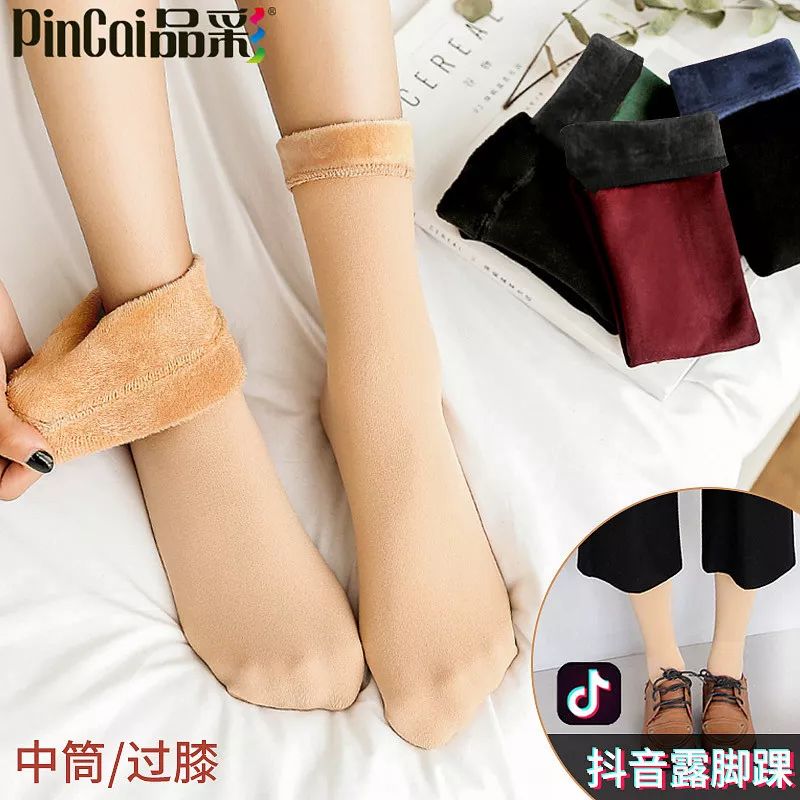 【商品名称】秋冬季毛袜子女中筒袜长筒光腿肉色加绒加厚过膝小腿神器雪地短袜