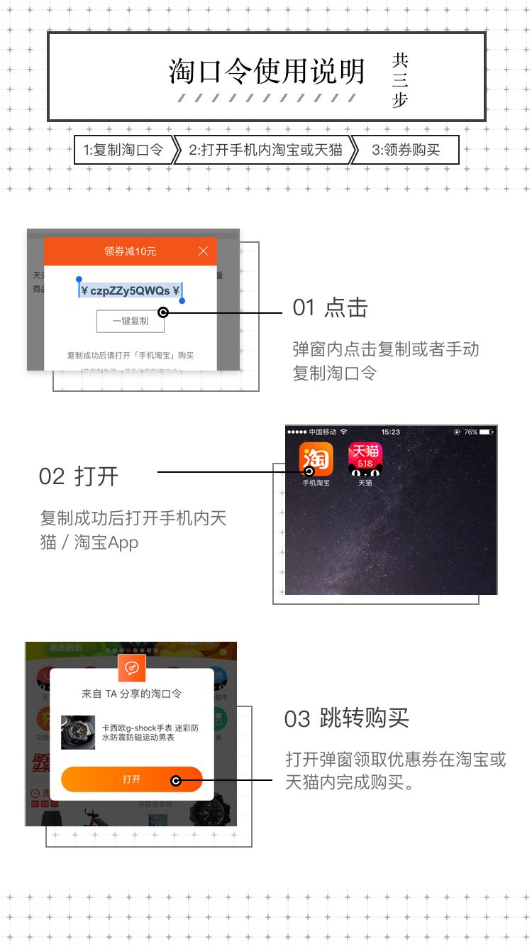 注:我们优化了购买流程,复制每件商品的优惠码(红色字体的部分,“¥”字符也要复制哦),再打开【手机淘宝】,等一会,一般是几秒钟(这个时间看手机和网络速度,手机越好,网速越快,等待时间越短)就可以领券购买了哦~