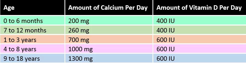 接下来划重点:钙的吸收离不开维他命D,在关注孩子钙摄取量的同时,也需要关注维D的摄取量。来看下不同年龄段的儿童对于钙和维D的需求量: