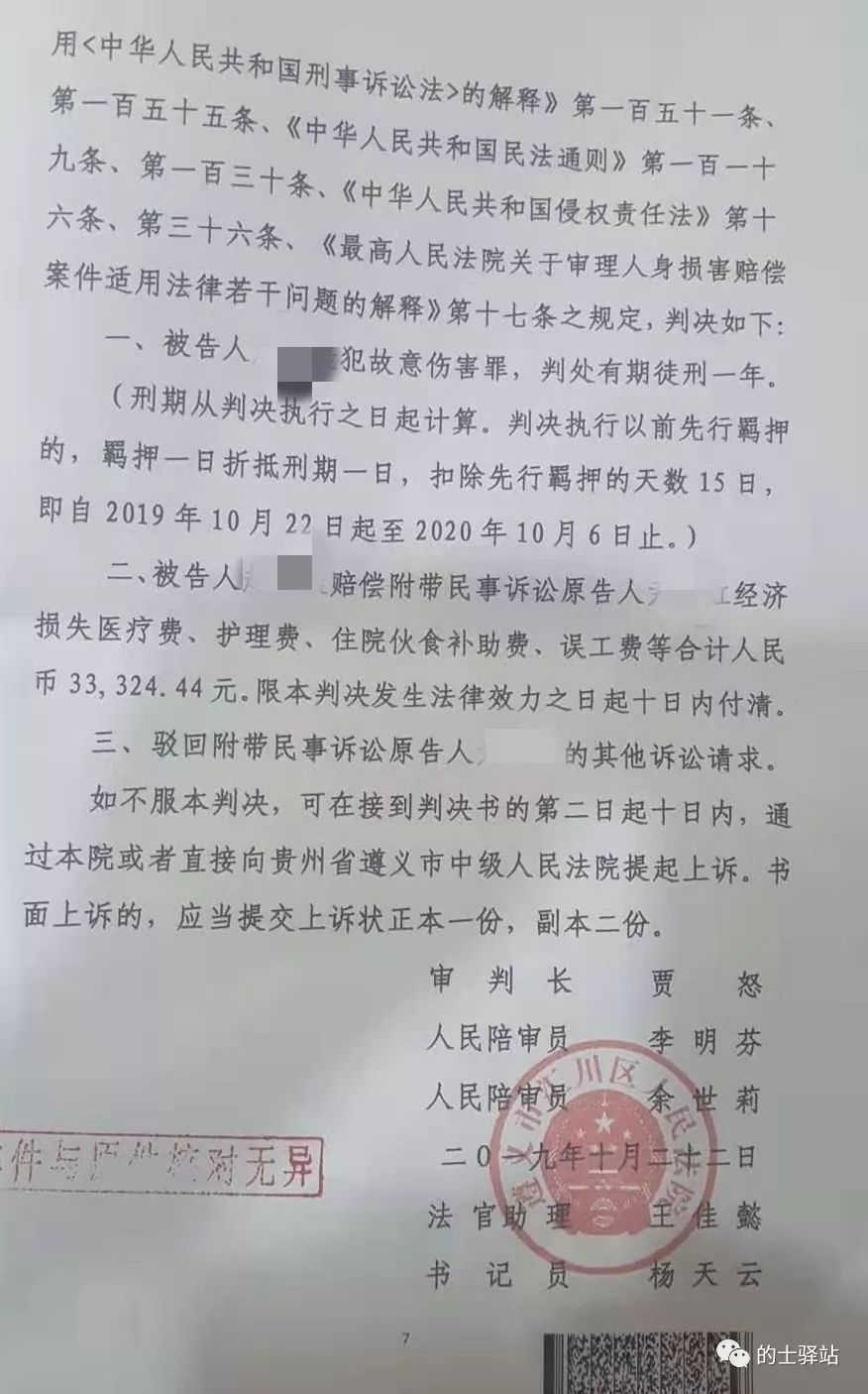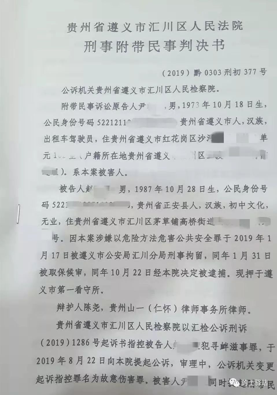 但是,近日,却有一个大快人心的好消息,从贵州省遵义市传来。10月22日,遵义市汇川区人民法院做出一审判决,判处殴打的哥致伤的歹徒赵某有期徒刑一年,并赔偿被打的哥各项费用三万余元。