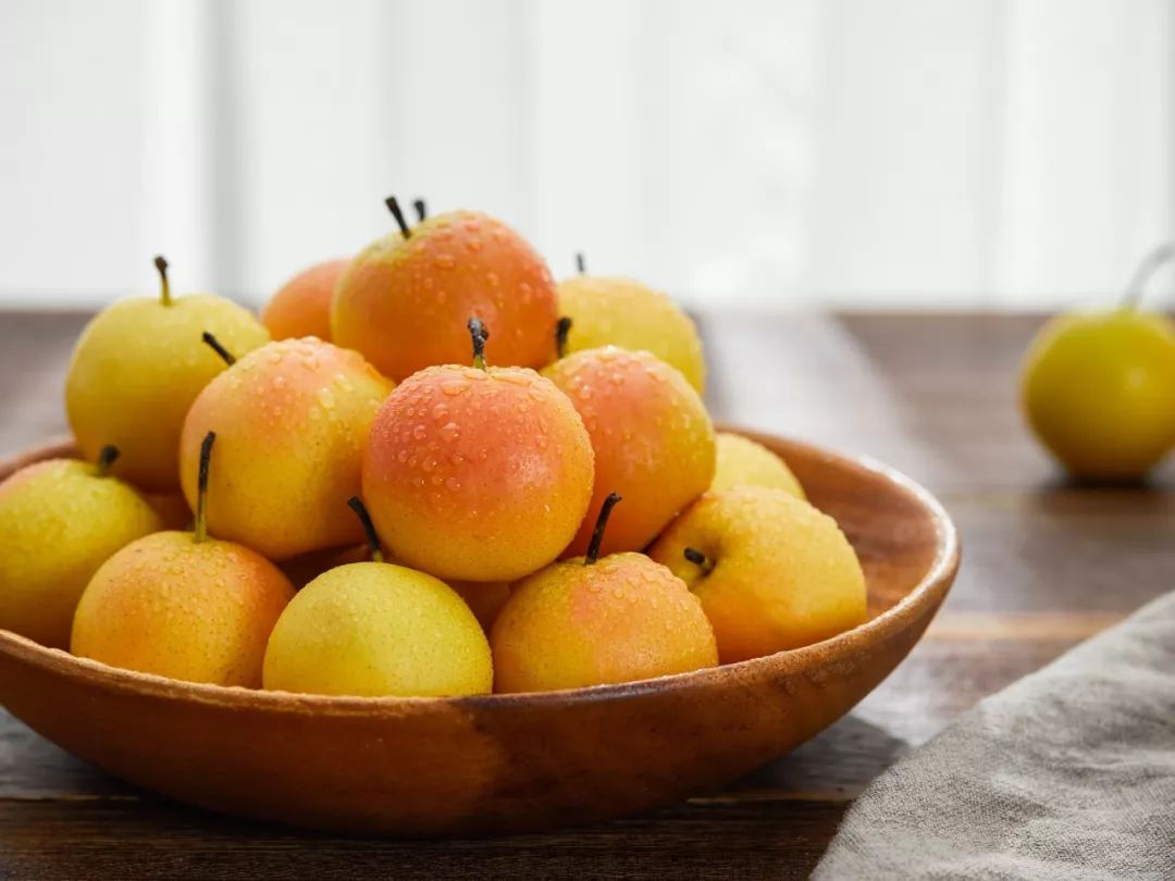 刚摘下的南果梨,果皮青绿,向阳部位呈粉色