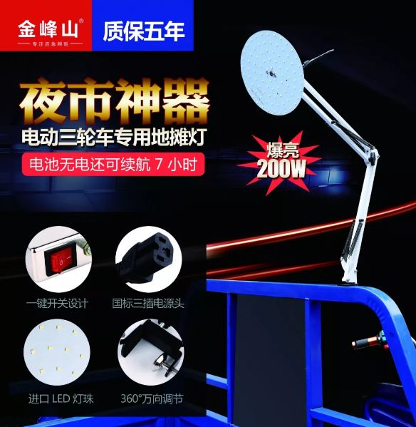 夜幕降临,华灯初上。夜市正是开始热闹的时候,但在夜市中,大多商贩都以电瓶为电源,私拉电灯照明。这样不仅危险,而且照明的效果也不佳 。然而金峰山照明电器厂此次的展品,电动三轮车专用地摊灯完美的解决了这个问题。