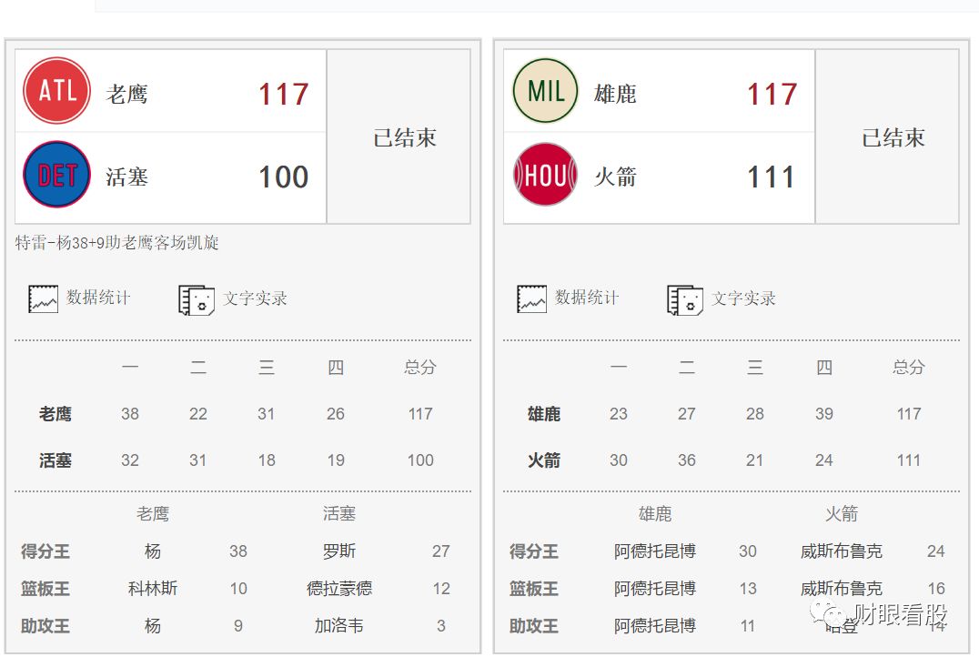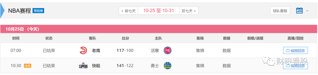 阅读本文前,请您先点击上面的蓝色字体“财眼看股”,再点击“关注”,这样您就可以继续免费收到最新文章了。每天都有分享。完全是免费订阅,请放心关注。 NBA常规赛已经进行到了第三个比赛日,其实今天一共有三场比赛,分别是老鹰VS活塞,勇士VS快船,雄鹿VS某西部豪强!