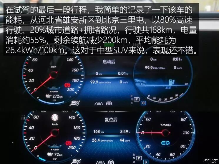补电完成后,我们也有幸对该车的能耗进行了一次初步体验。起点为河北省雄安新区,终点为北京市三里屯奔驰体验店,全程将近170km。出发时间为14:09,当时车辆的SOC约为80%,剩余续航为272km;经过4个小时的时间(仪表中显示行驶时间为3小时49分钟,中途在高速服务区休息的时间并未计算在内),我们终于到达了目的地,路程中基本上有80%的路段为高速路段,且车速一直保持在100-120km/h之间,达到市区后还经历了1个半小时的拥堵。最终,剩余电量大约为25%,剩余续航为72km,比出发时减少了200km,表显平均能耗为26.4kWh/100km。这个成绩虽然不是特别省电,但是对于EQC这样车重达到2.5吨的中型SUV来说,表现已经算是不错的了。不过,这次的试驾只能对能耗方面有一个初步体验,待我们拿到试驾车后,会为进行更严谨的能耗和续航测试。