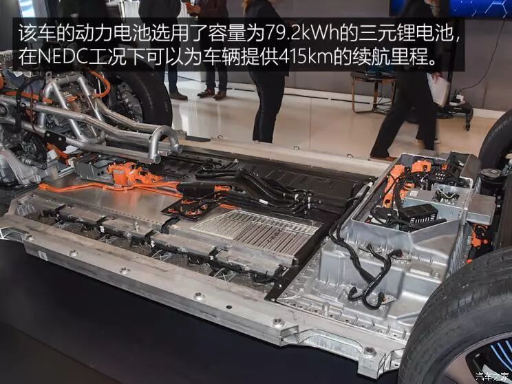 该车的动力电池选用了容量为79.2kWh的三元锂电池,共有6个模块组成,其中4个72电芯模块和2个48电芯模块组成,总的单体电芯数量达到了384个,动力电池的安装位置位于座舱下方的底盘上。电池周围通过铝合金框架进行保护,防止在碰撞时伤害到电池从而带来更严重的伤害。整个框架设计了两层缓冲区,而奔驰也针对B柱位置进行了碰撞试验,在32km/h的碰撞速度下,框架可以保证电池系统不受到破坏,同时车内乘客也能够有足够高的安全性。