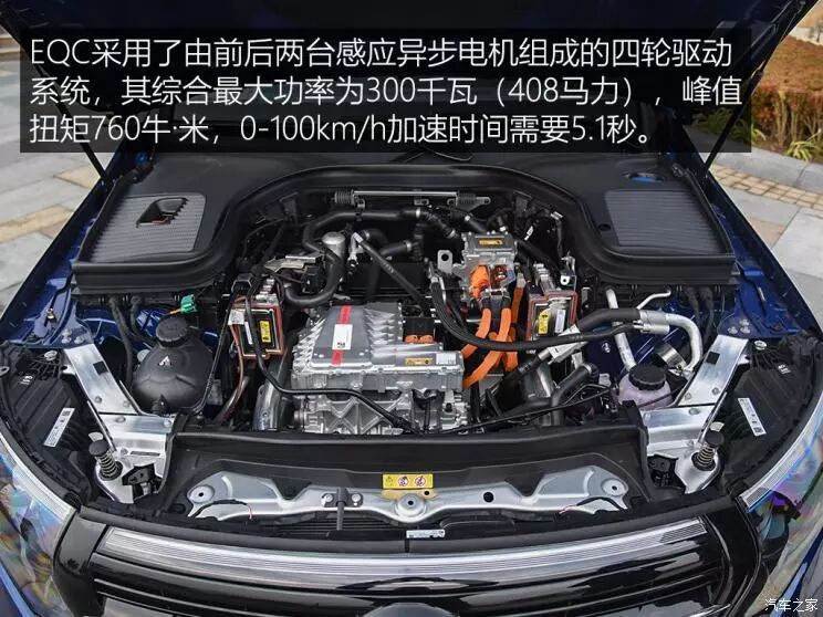 北京奔驰EQC的动力系统与海外版EQC相同,由前、后两台感应异步电机组成,最大功率300千瓦(408马力),峰值扭矩760牛·米,官方公布其0-100km/h的加速时间为5.1秒。这对于一辆中型SUV来说,动力方面可以说是相当充沛了,满足日常驾驶肯定没有问题。只不过,前、后两台电机都采用了感应异步电机,而没有选用功率密度更高的永磁同步电机,这可能会比较影响该车在城市低速工况下的能耗表现。