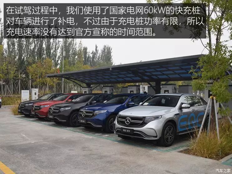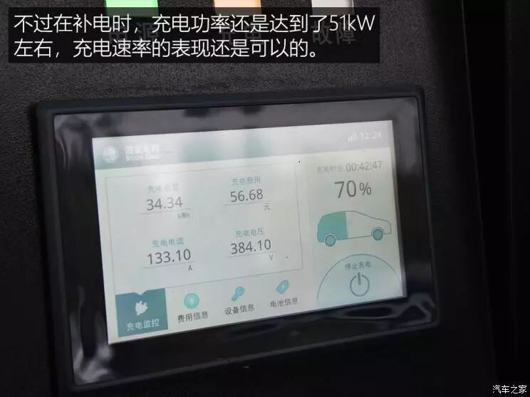 此次试驾路程相对较长,所以途中我们使用了国家电网快充桩为车辆进行了补电,充电桩的功率为60kW。充电时,车辆的充电电压达到了380V以上,而充电电流则达到了130A以上,此时的充电功率为51kW,充电速率还算可以。但由于充电桩功率的限制,并没有达到EQC可以承受的最大充电功率。
