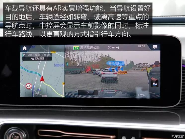 在导航中,试驾车还配备了AR实景增强功能,当车辆在导航功能中设定好目的地后,沿途比较关键的路径点,比如需要更换车道或者转弯时,中控屏会将摄像头采集到的的道路画面显示出来,并在其中添加箭头等标识,引导驾驶者行进至正确的路径中。相比于语音以及导航中的动画提示,这种功能更加直观、实用。