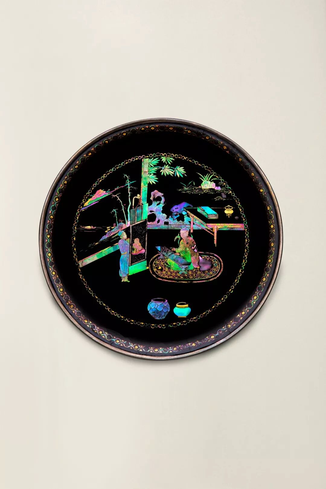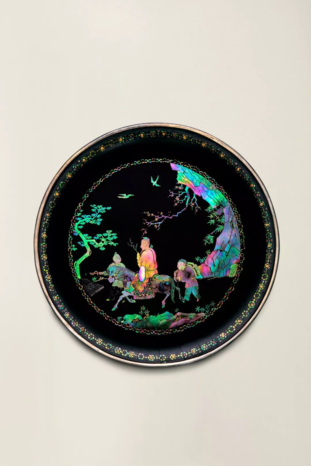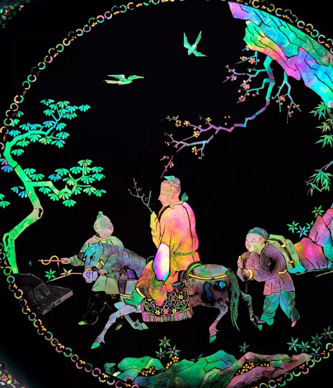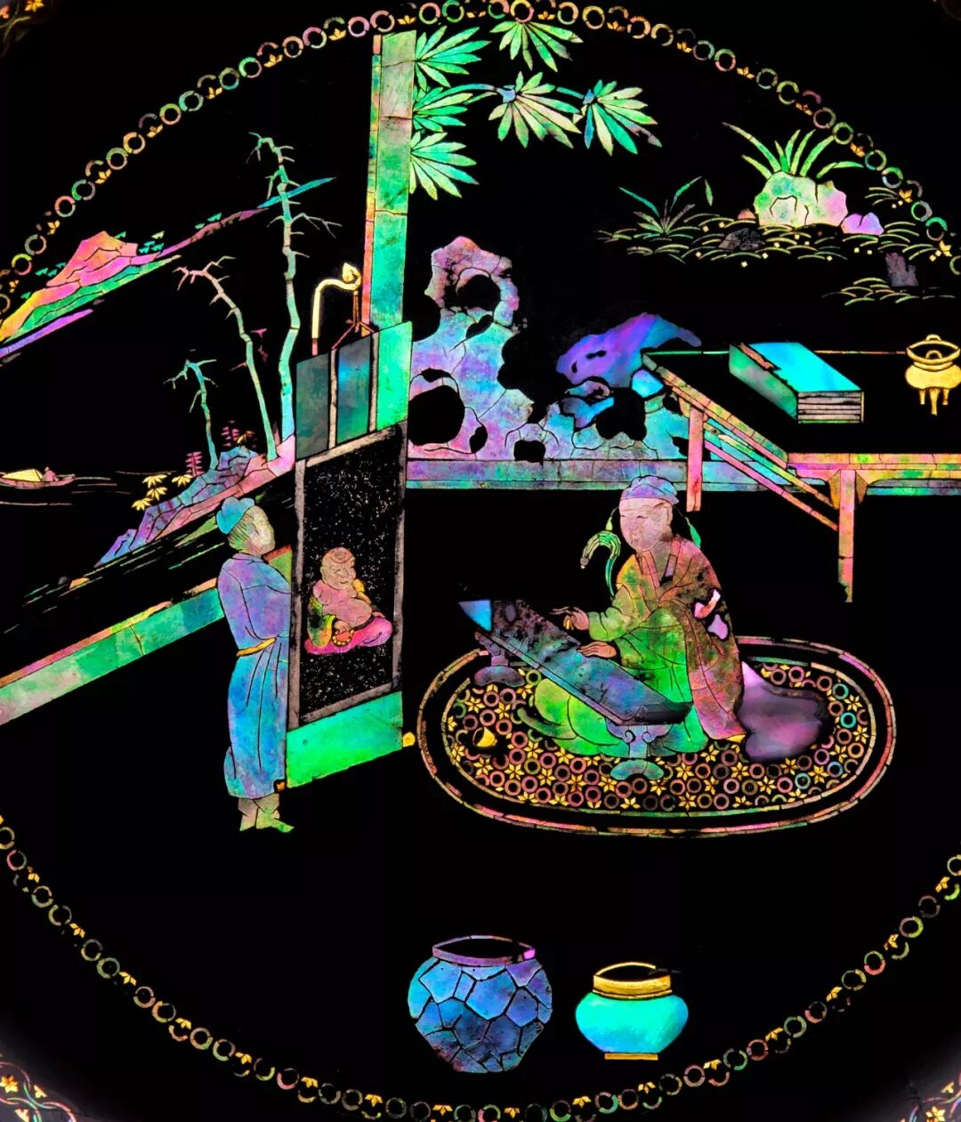 为英国水松石山房旧藏,两件香盘均表现园林庭院一角及山水人物的闲居活动,取材自《孟浩然踏雪寻梅》与《焚香观画》之故事情节。人物、花木、奇石等皆细心选配不同色彩的螺钿,加以镶嵌,异彩纷呈。细如人物五官、衣纹与姿态俱栩栩如生。底部有「千里」款识。螺钿光泽堪比翡翠,赏心悦目,诗人刘应宾(1588~1660)有诗赞赏云:「螺钿妆成翡翠光,紫霞秋澈婺州香,形态俱美真通太,假寐仍期到醉乡。」江千里为明末清初著名漆器工艺家,扬州人,一说浙江嘉兴人。他善制嵌镶螺钿漆器,工艺精湛,所制漆器多有「千里」款。入清以后,「千里」二字已成精致螺钿漆器代名词,嘉庆《重修扬州府志》载时人流传:「杯盘处处江秋水,卷轴家家查二瞻。」