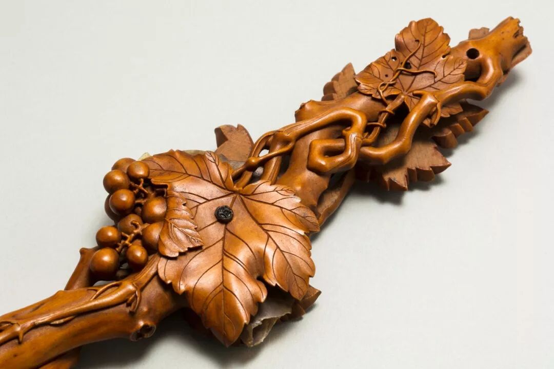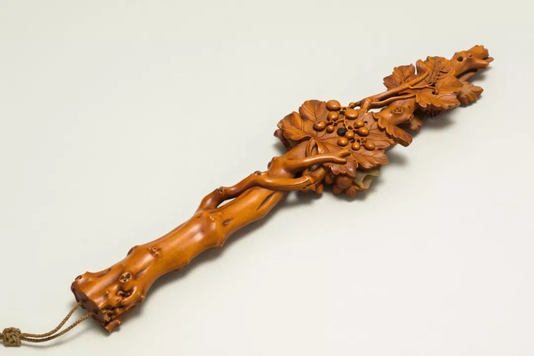 取黄杨佳木精刻扇柄,扇柄两面满雕葡萄藤蔓,葡萄硕果累累,珠圆玉润,各具妍姿;果叶舒张或翻卷起伏,隐起圆滑,生动自然;藤蔓虬曲牵缠,惟妙惟肖,须梗纠蟠,如扭铁丝,蜿蜒缠绕,或由下而上,以自叶面蛀洞穿而出之者,有画龙点睛之妙,尤见艺匠鬼斧神工、般尔之能。此作无名款,由雕刻主题、风格与材质观之,当出于晚清雕刻名家周义之手。周义(1861~1911),又名周三,湖南长沙宁乡县人。晚清著名雕刻家,与画家杨世焯(1842~1911)、湘绣家萧咏霞(1887~1954)同为宁乡县麻山人,三人被誉为「宁乡三绝」,也被誉为「麻山三杰」。所刻多檀栴黄杨,或以象齿,然不恒见也。所作诸器皆善,而扇骨为最工。所作多不镌名款,虽花叶层迭,枝柯磥砢,而圆润如珠玉,拊之滑不溜手。其涩而拒手者,伪作也。周义尝云:「刻工十之四,磨工十之六」,盖磨尤难于刻也。
