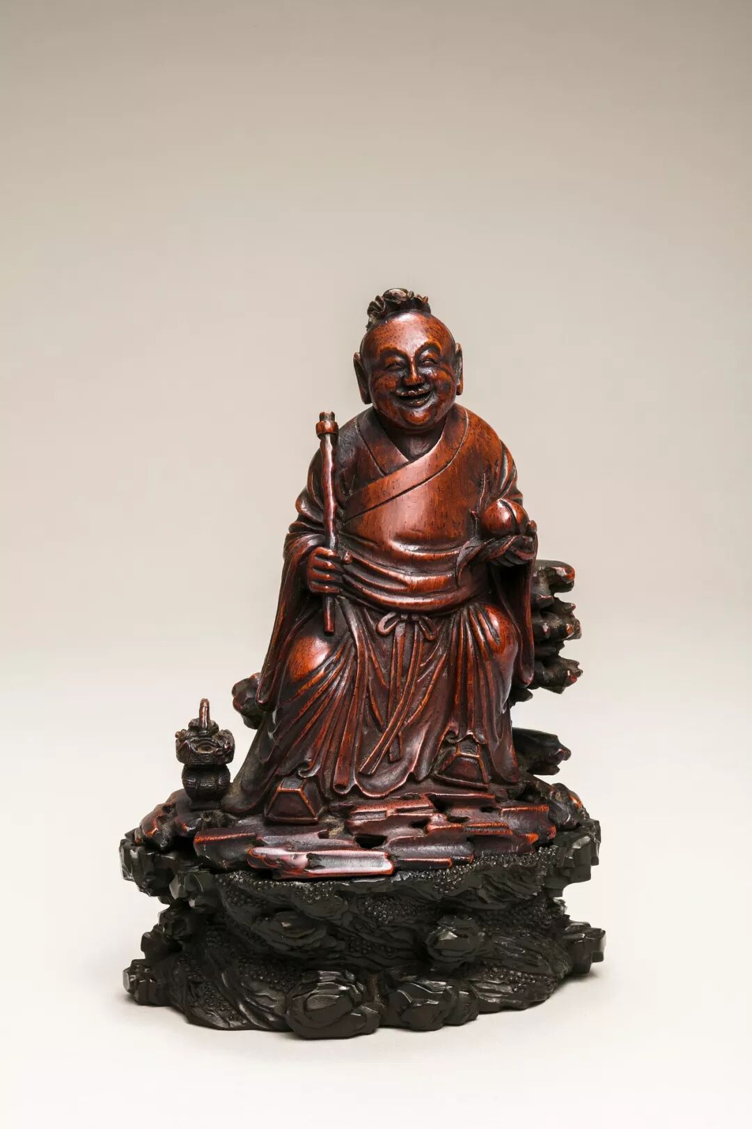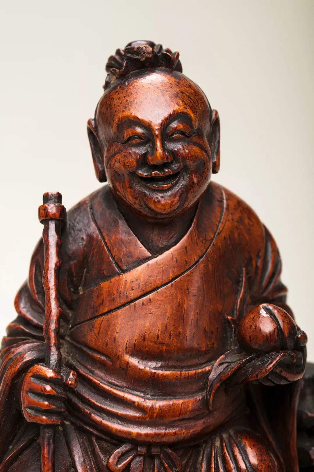 传为嘉定竹人蔡时敏所制,以整料竹根圆雕镌成,色呈枣红,莹润古朴。东方朔倚坐于湖石之上,束发岸帻,隆额高颧,脸庞圆润,眉开眼笑。身穿广袖宽袍,腰系帛带,于腹前缀结;袍裙蔽膝,足蹬布履。右手执药锄,左手捧寿桃,脚边置有药篮。东方朔神态自若,笑容可掬,带有诙谐幽默之神情,流露神仙之气。刻者攫捉人物瞬间开怀灿笑之神态,于五官细节处雕琢细腻;善用竹根之形质,存于意想,随类赋形,更见功力,人物、衣纹线条流畅自然,修饰光磨之工,而与湖石坡坨之处处层迭、洼隆与崎岖方折,游刃于狭隙之间,恰成对比。此作无款,以雕刻风格论,推为蔡时敏之作,曾著录在台北国立历史博物馆编《尚像成形:中国传统竹雕艺术》(1996)一书。
