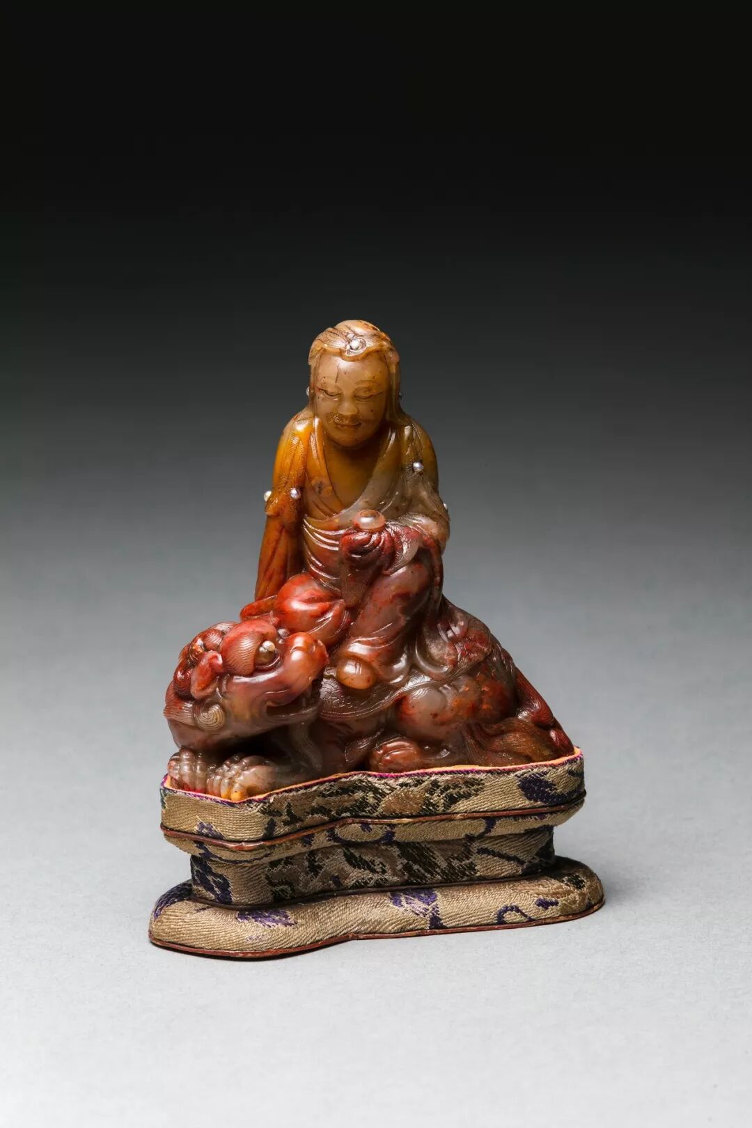 寿山石雕刻而成,石质温润细腻。采圆雕与浮雕精镌之,刻画细致,尊者衣纹鲜明而有质感,手持净瓶,眉宇低垂,俯视芸芸众生,神情庄严慈祥,青狮回首凝望,似在谛听说法,神态生动自然。文殊菩萨为「华严三圣」之一,利显智、慧、证,象征智德、正德,与普贤菩萨相对应,为娑婆世界释迦牟尼佛的右左胁侍,其座骑是青狮。此作为英国水松石山房旧藏。
