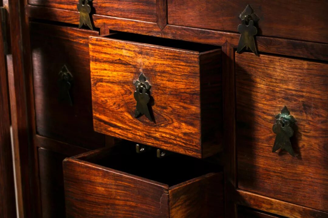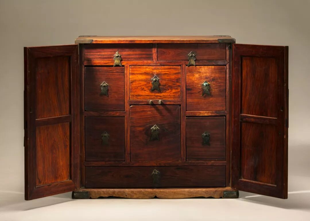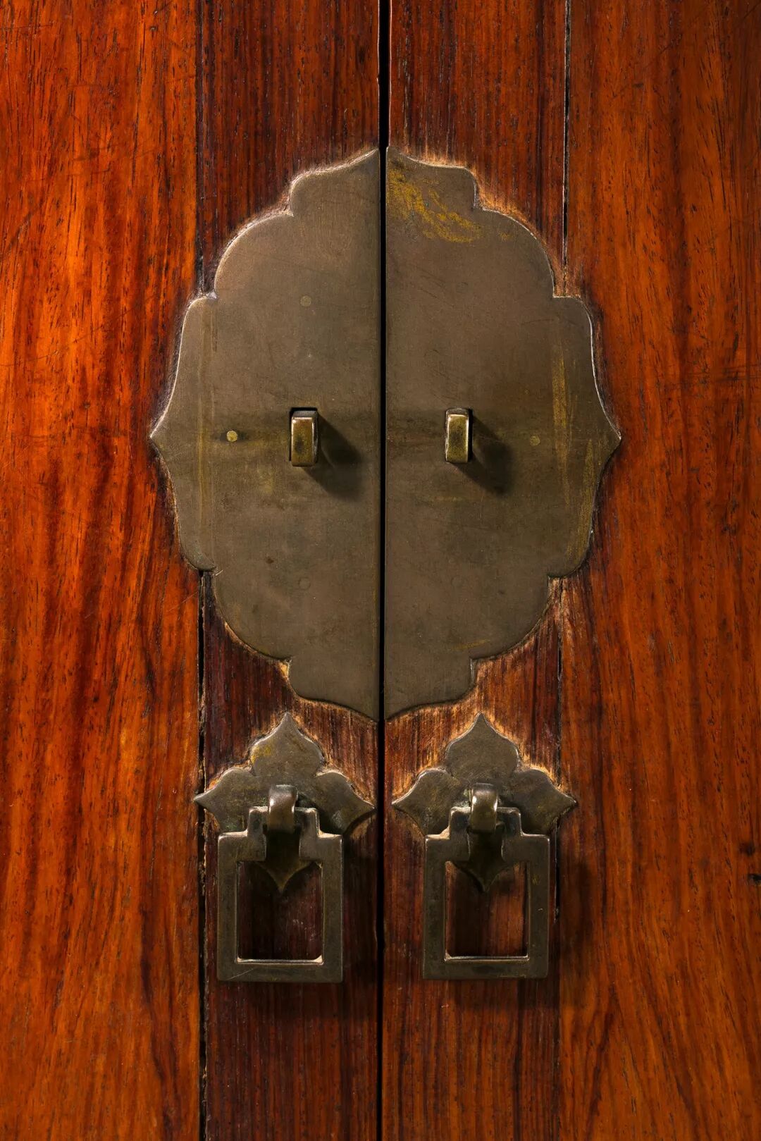 选材为黄花梨,纹理华美清晰,对开门式,双门与侧面两板皆为独板,叶边廓锁插门方框拉手,箱侧有弧形把手,箱体沿边与底座亦包镶铜片,与黄花梨温润色调适所相宜,亦起画龙点睛之妙。下承壸(kǔn)门底座。《鲁班经匠家镜》名之为「药箱」,实则此类箱子多抽屉之设计,除药品、珍贵香料外,更适宜分屉储藏书册、信札或笔墨纸砚等文玩器物,多用于文人书斋。