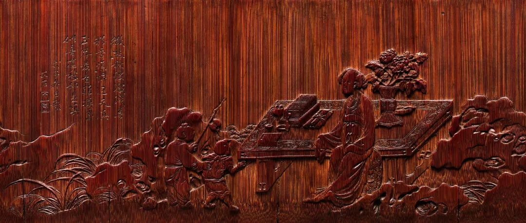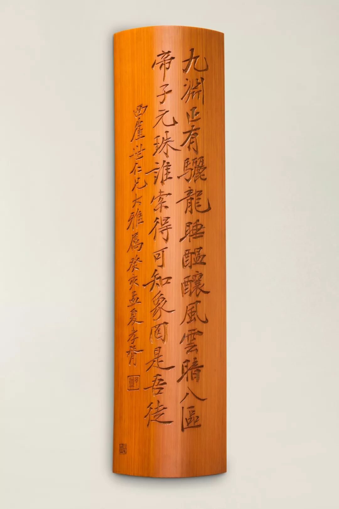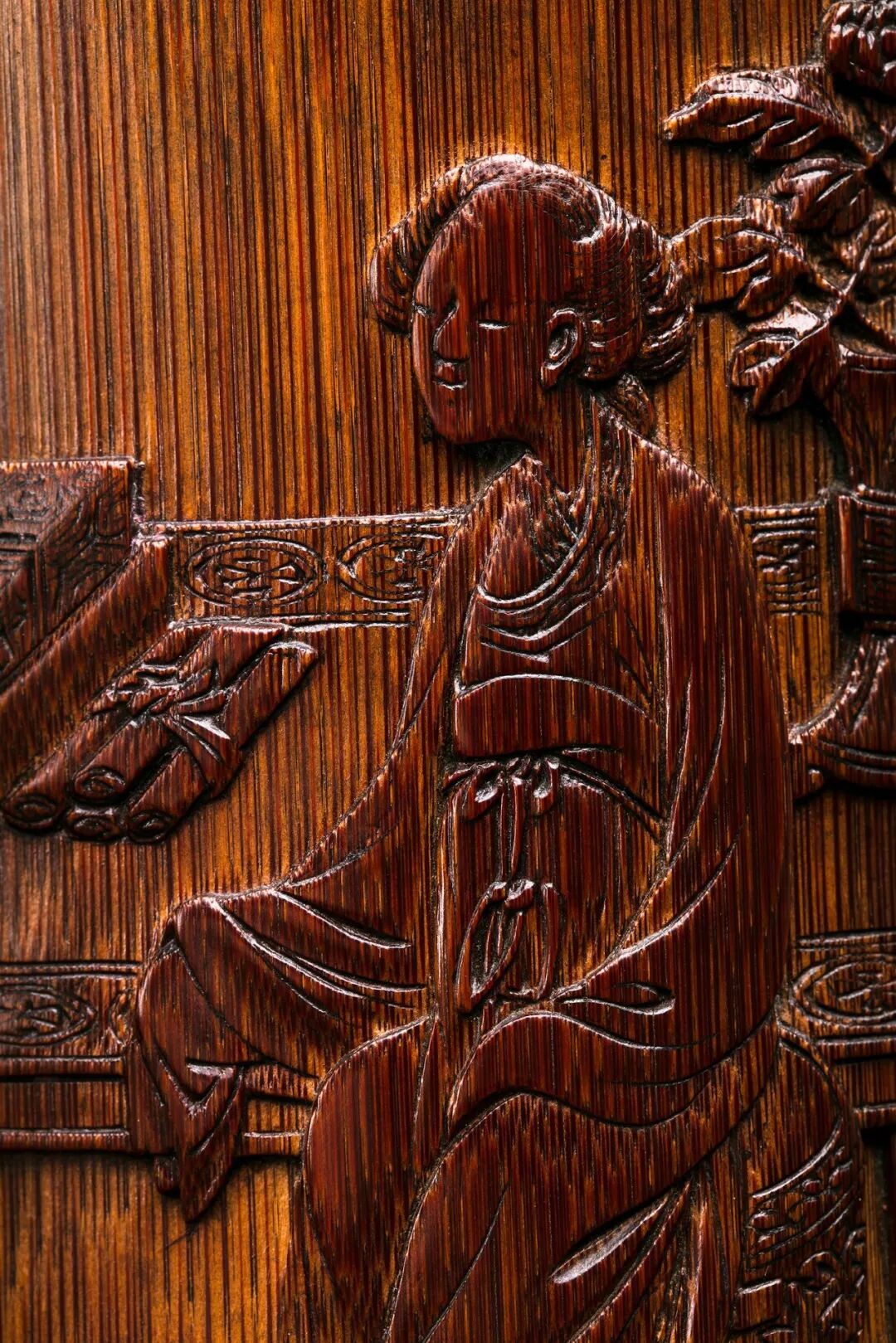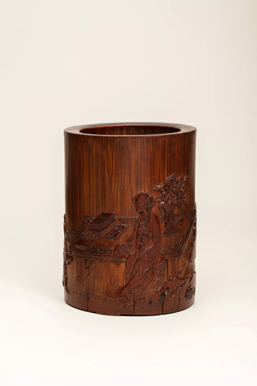 出自嘉定竹刻名家邵文右之手,制于清康熙四十七年1708,以通景式构图刻晚明吴江才媛叶小鸾(1616~1632)闲居临案之景及其诗作《又题美人遗照》小诗:「微点秋波溜浅春,粉香憔悴近天真,玉容最是难摸处,似喜还愁却是嗔。」此首七绝为叶小鸾读《西厢记》、《牡丹亭》,因见前有莺莺、杜丽娘像,心有所感,因而题诗于书上者。叶小鸾,字琼章,晚明吴江人。父叶绍袁、母沈宜修,姐叶纨纨、叶小纨皆为著名诗人、文学家。小鸾貌艺双全,诗书画兼能,有「德才色三不朽」之誉,年仅十六,未嫁而逝,家人咸以为仙去,有《返生香集》。笔筒采用减地高浮雕,辅以阴刻等技法镌成。雕工精湛,刀法变化多端,种种文图浮雕隐起,运刃出之。刻石顿挫有力,人物衣着行云流水,花卉叶脉则深镂之,层次分明,纹理装饰细如发丝,煦煦清雅。邵文右,(此前文献误作朱文右,今从传世署款作品实例更正。)或作文友,号筠斋,师从清初竹刻第一高手吴之璠,尽得其指授,嫡传绝艺,为其女婿及高足第一。是件作品构图纤秾雅致,刀法洗练精绝,堪能媲美上海博物馆所藏吴之璠二乔并读书图竹笔筒。清金元钰《竹人录·吴之璠 朱文友》:「婿文友得父翁指授,能传其艺。」