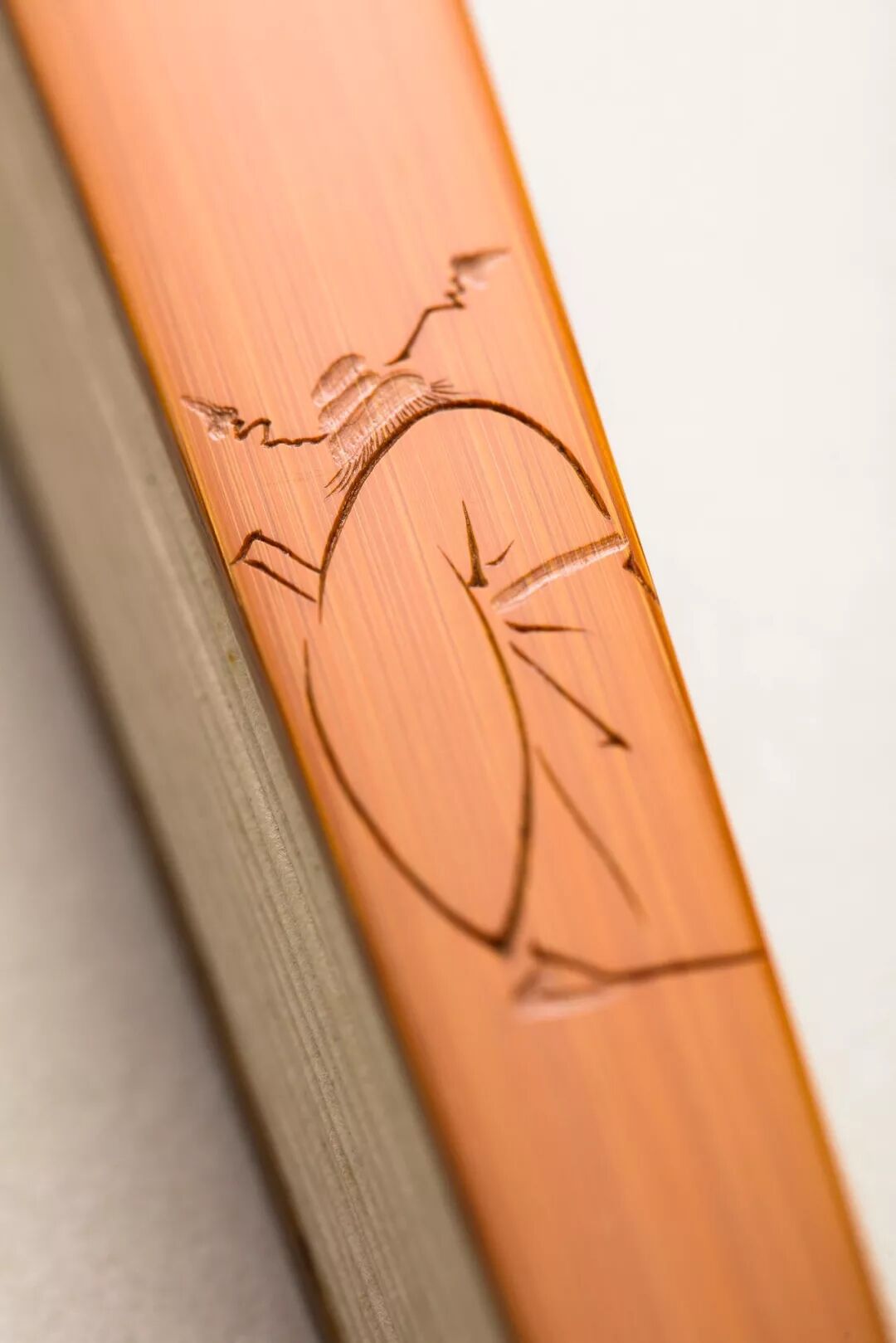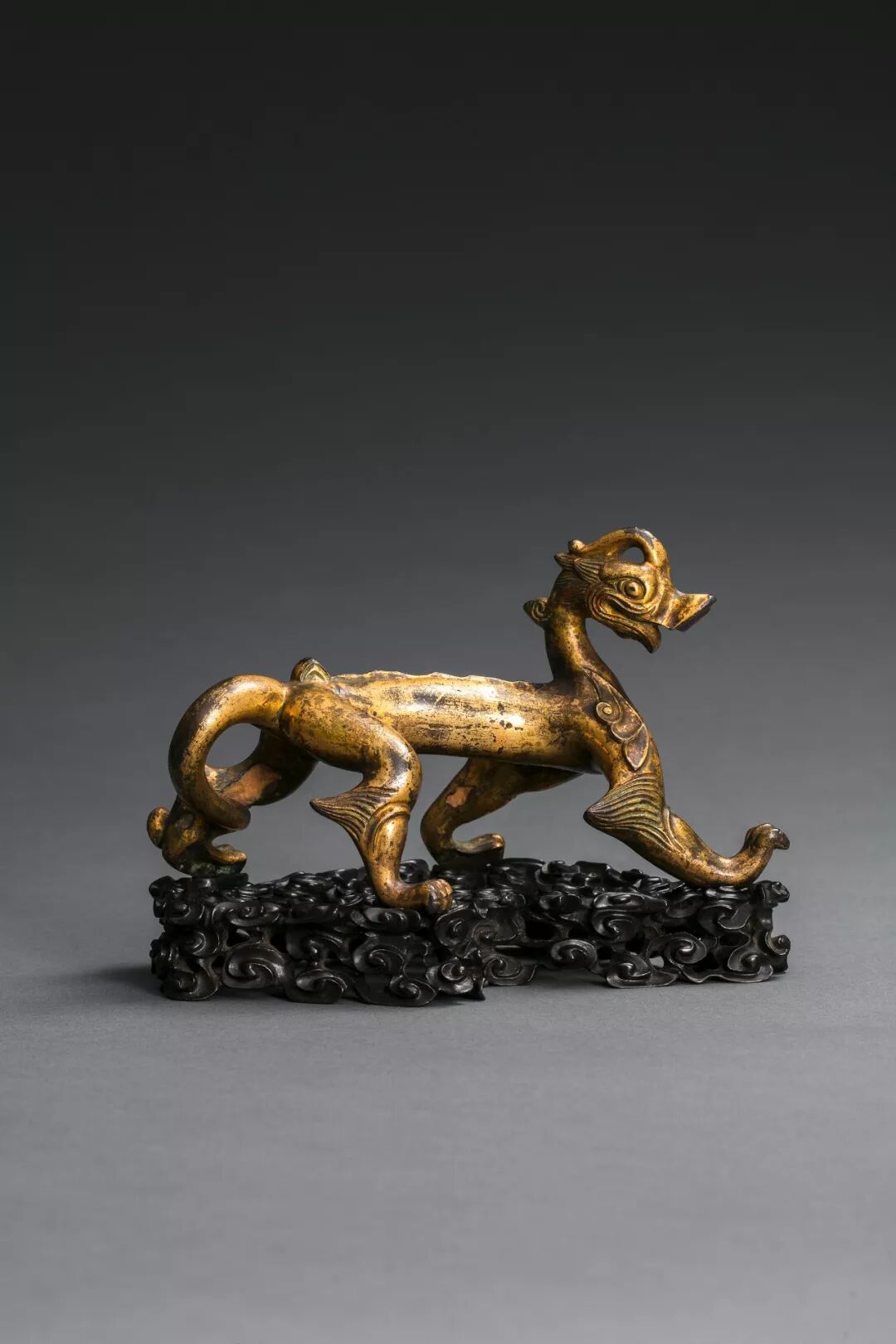 铜铸鎏金行龙笔格,拨蜡法精铸,铜质精纯,入手沉重,鎏金纯美匀亮。行龙造型古朴,目光炯炯有神,昂首阔步,姿态威猛,神气十足。其右足前探,左足后弓,肢爪有力,其蓄势而发之姿,张力十足,腾挪矫健之态,极富动感。螭龙背上镌有凹凸起伏的背鳍,双足有突起的锥形火焰披毛,形成可倚搁之处,正可搁笔,以供文房受用。笔格即笔搁,古有其制,是书案上置笔或搁笔的用具,为文人书斋必备、文房用品与长物清翫中不可或缺之物。其形制与材质,于历代演变各具特色,大凡以具山峦起伏之形或蟠屈之状,可供卧笔者为佳妙。