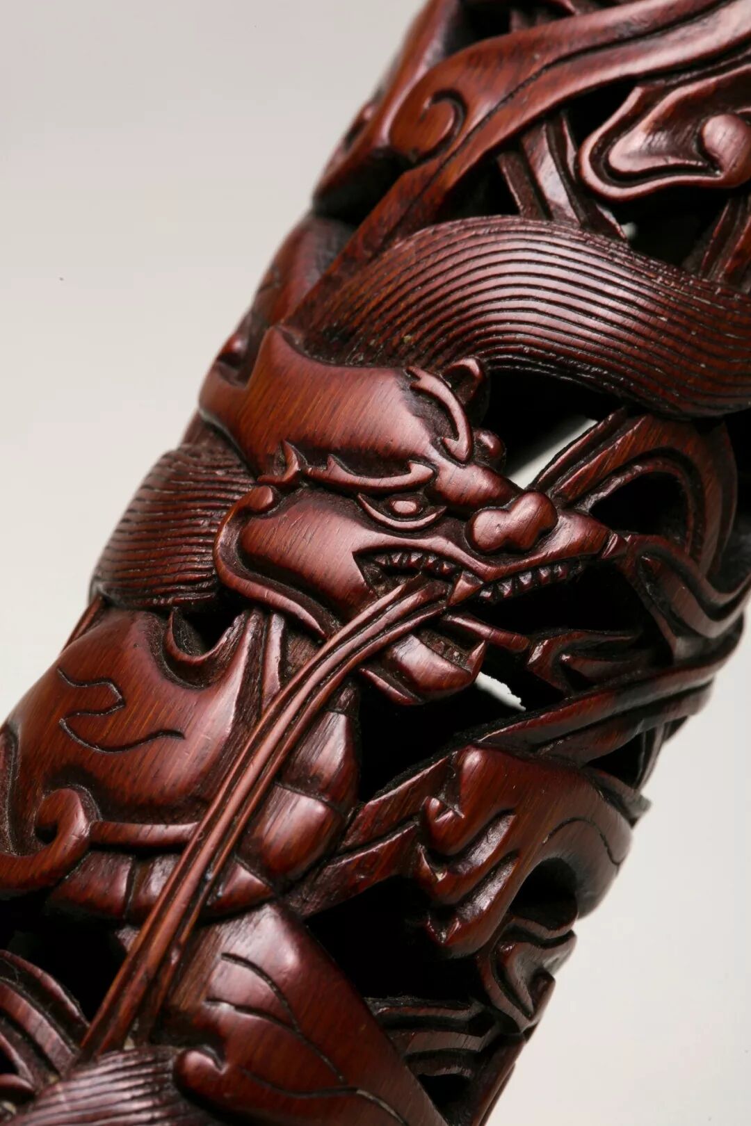竹刻香筒,色泽沉穆,葆光莹润。两端以回纹为边,筒身周匝透雕双螭,俯仰相对,双螭昂首瞠目,张吻吐舌,口衔灵芝。螭龙须发戟张,肢爪有力,灵芝回旋蜿蜒,满布器身。整体构图全以弧线、曲线组合搭配而成,以螭脊一线作主旋律,其它则为伴奏与和声,形成强弱激荡、深浅抑扬、回转流畅等各种变化及动感效果,犹如绕梁乐曲,饶富韵律之美。螭龙纹饰多见于明代织锦、家具等工艺精品,为明人精心之制,堪与王世襄先生俪松居旧藏「明双螭纹透雕香筒」比肩齐声。