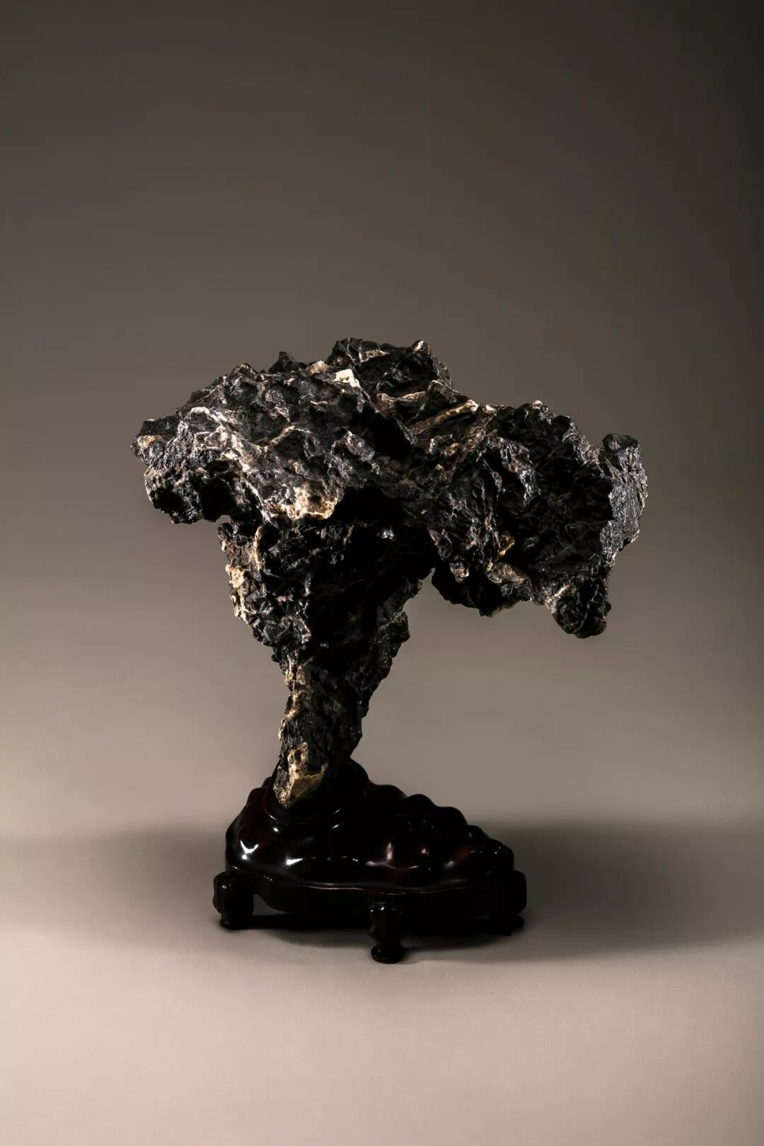 天然英石,石色湛黑,透出青韵,间杂白、黄色石纹理,色泽莹润。兀立孤峦,峰顶巨硕,状如突出危岩,其势险峻,奇崛多皱折,石面满布皴皱嶙峋,间有深岰洞壑巉岩,其山势侧偏斜欹,如自昻霄而降,形如飞来之峰,故名。