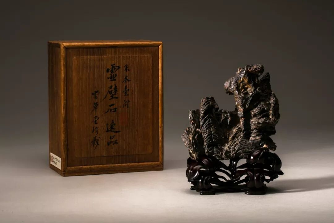 为祈连石砚山,形如数座奇峰耸峙,峦头亦似蟠螭,石势奇崛显怪,如种种奇形异状,石柱、深岫或凹穴纵横歧出,石面纹理嶙峋遍布,若鬼斧神工。迭经日本云草堂、英国水松石山房旧藏,流传有序,并附水松石山房主人莫士撝先生所绘《砚山图》一帧,传神取意,颇得奇峰异石之逸趣,相得益彰。