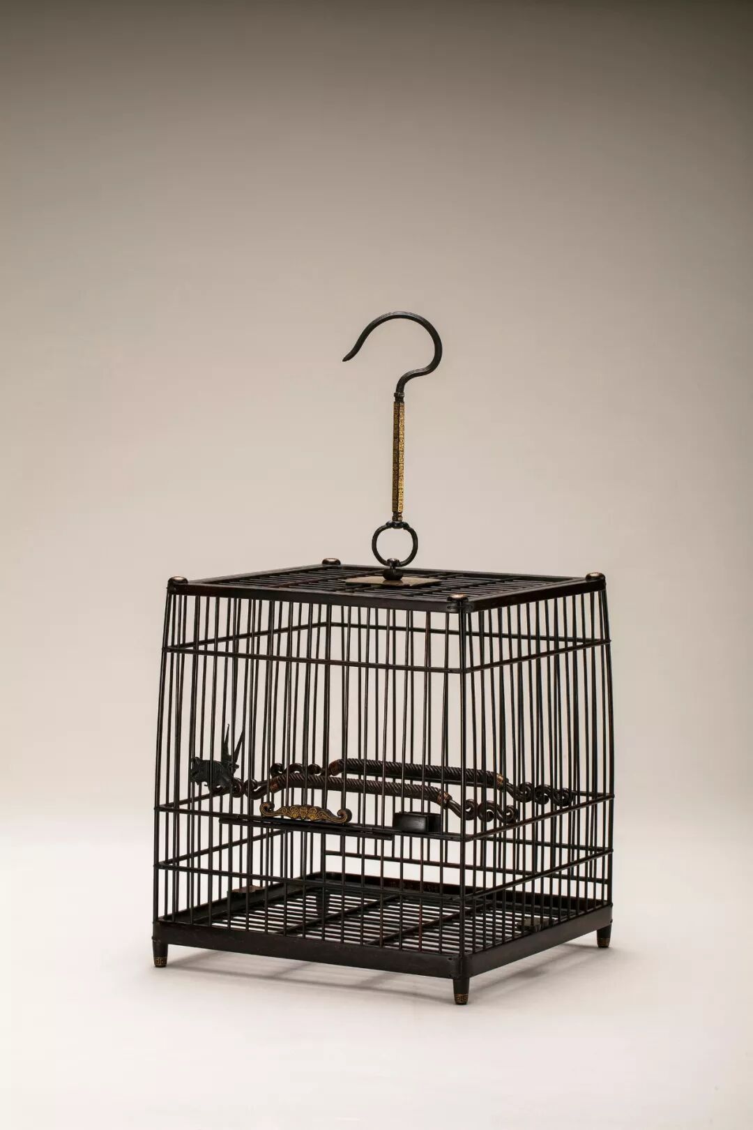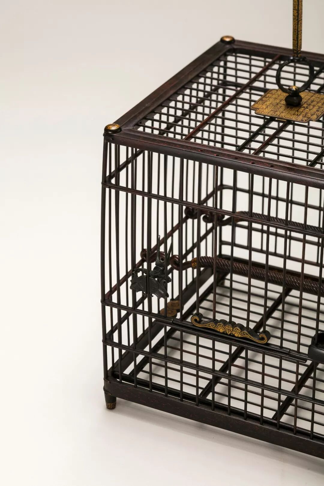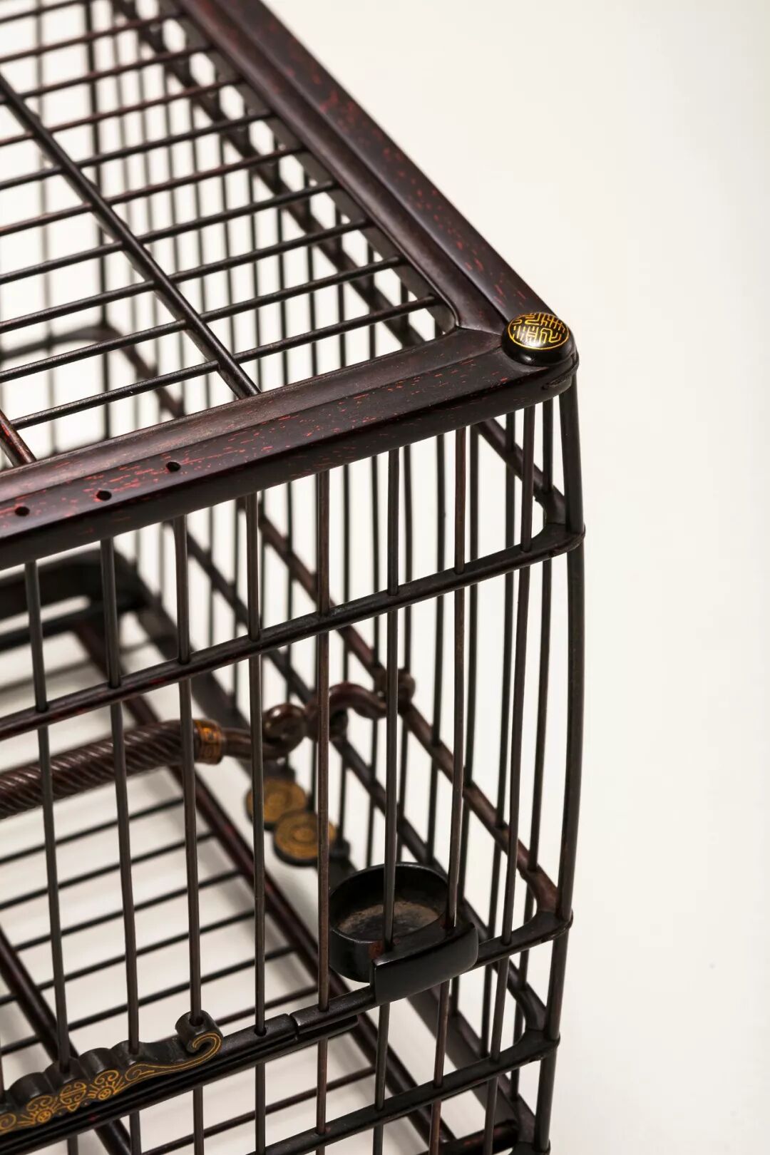 出自近代苏州制笼大家金三畏之手,紫檀嵌金丝打造,方形鸟笼,底部稍大而顶部略缩小,为典型苏式「官印笼」。纵向笼丝为手工弯制,弧度统一,单边均为17根笼丝,骨架梳条各光滑细腻,整齐划一,粗细、间距均匀。横档穿孔打眼,梳条穿嵌,榫榫紧扣,精准到位,穿插后严丝合缝,密不透风。四角以丝线扎紧收束,不露线头,充满张力,制作难度极高;整体造型美观,设计精准,俱见匠心。