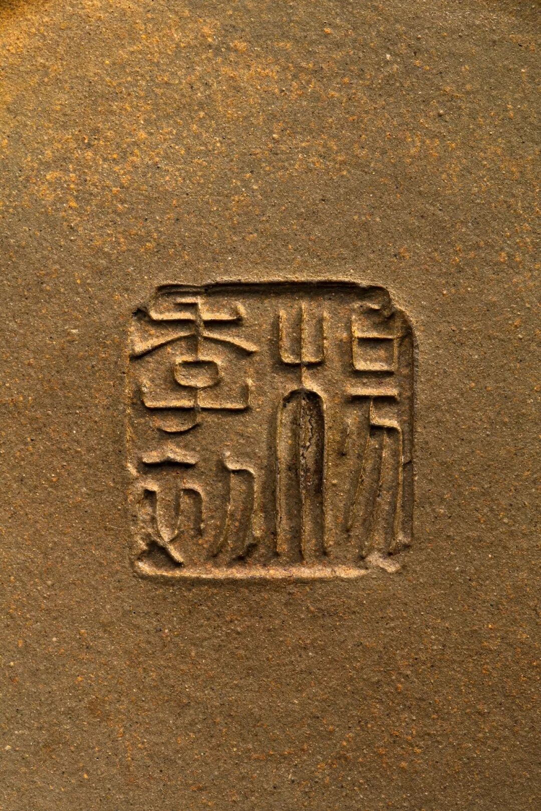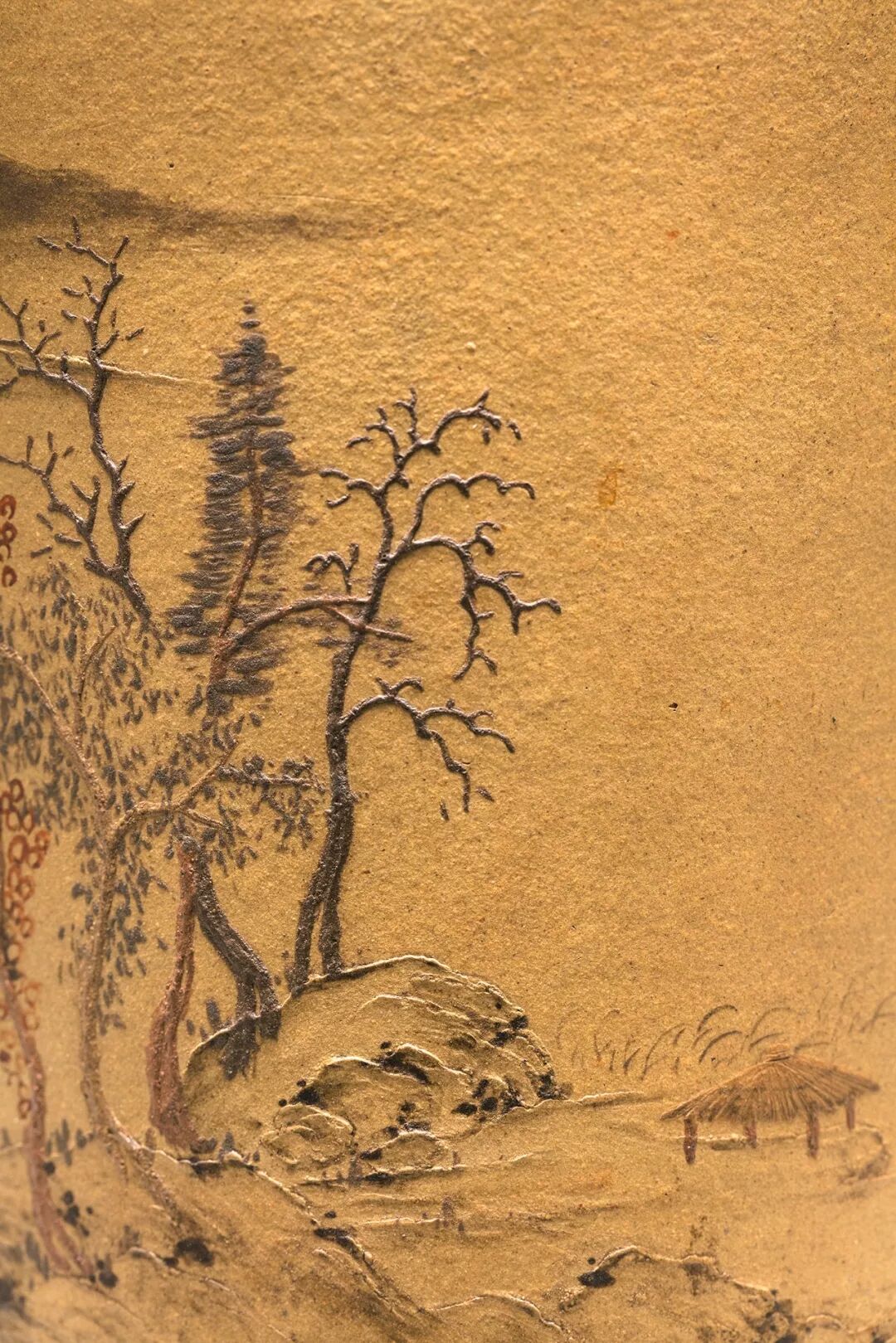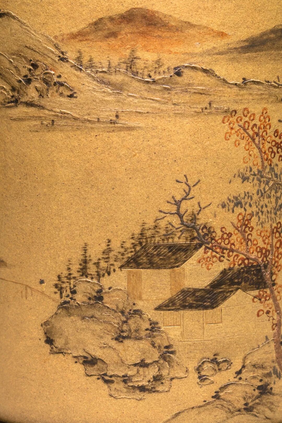 为杨季初制紫砂名品,以宜兴本山粗绿泥为体,敷以嫩黄泥为表,泥绘并浮雕色泥于外壁。构图采通景平远法,远山起伏,施以披麻皴,近景坡岸以小斧皴兼苔点,呈现出山石嶙峋质感;前有疏林屋宇,参差错落,深浅浮雕、浓淡墨色以突显其层次感。当代宗师顾景舟尝言:「杨季初的作品将文人画的气息表现得淋漓尽致,画面构图、意境极具书卷气,是紫砂陶在昌盛时期曾作为文人高雅文玩的明证。」杨季初,活跃于清雍正至乾隆年间,江苏宜兴人,创始紫砂色泥堆绘艺术,为陶艺美术增添一类专门技法。杨季初文化涵养深厚,深谙绘事六法,为兼擅雕塑之能手,取法高古意韵,继陈鸣远之后,有一代大师的雅誉。