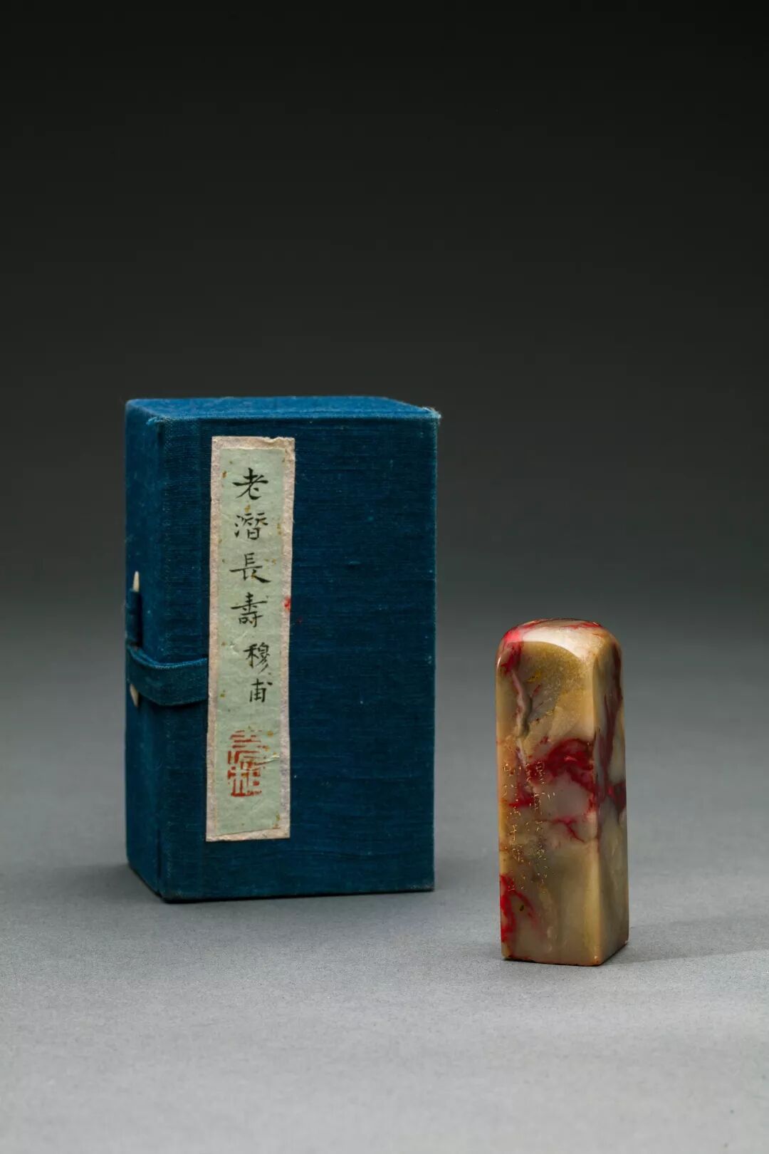 鸡血石印,近代篆印名家黄士陵(1849~1908)铁笔所镌,印文:「老潜长寿」;作家、书法家张充和(1914~2015)旧藏,并为印盒亲署题签。黄士陵,字牧甫,亦作穆父、穆甫,号倦叟,安徽黟县人,为晚清时期书画篆刻家、「黟山派」开宗大师。早年法邓石如、吴熙载,后宗秦汉玺印,以汉砖文字和鼎、镜、铭、诏版、泉币文字入印,参以商周金文体势笔意。篆法方圆相参,静中有动,巧中有拙。侧款用北魏书体,爽朗豪沉,能在皖、浙二派外自成一家。