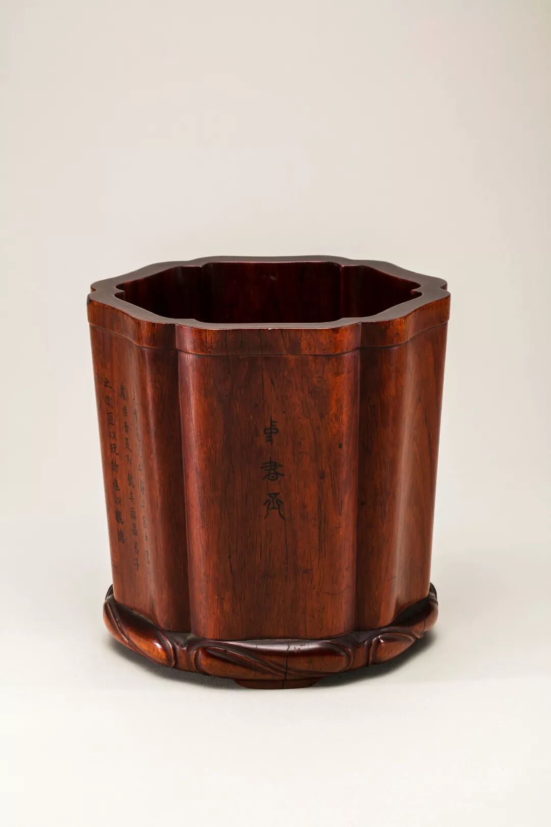 精选黄花梨良木美材镌制,葵形笔尊。敞口,斜壁,底有三矮足。底座略弧突,浅浮雕起六棱葵花花瓣,又与笔筒底部阴刻变形葵花纹线条相连,并呼应筒身形式,其构思设计,精绝巧妙,为其显著特色。筒身呈葵花形六瓣花式,每一面均微微凹进,又于筒身内部起棱,相较于圆形笔筒可运用辘轳协制,此葵形笔尊之雕造难度极高。
