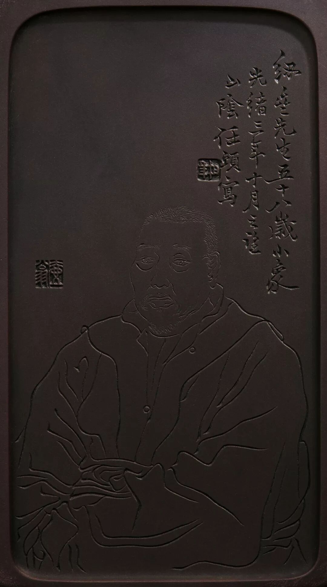 老坑端砚,石色紫赭泛红,石质坚润如玉,呵气成泽。砚作长方,砚面开砚堂,四周起唇,深雕斜通式砚池,砚侧两面镌有钟佩贤篆书题铭。旧配楠木盒,里髹黑漆,盖面为黄福懋隶书刻铭。砚背覆手,坳入宽平,镌刻任伯年所绘陈允升小像,衣褶线条遒劲流畅,人物容貌以极浅阴刻为之,形神毕肖,精妙绝伦。画像右上行书题刻:「纫斋先生五十八岁小象,光绪三年(1877)十月之望,山阴任颐写」,左侧阳文「壶翁」印款。由其修洁明快之刀法、肖像面容所采的浅刻风格推测,很可能出自晚清雕版、篆刻名家、竹人蔡照之手。上海博物馆藏〈蔡照 竹刻人物臂搁〉为其浅刻人物风格之代表作,可为参照。