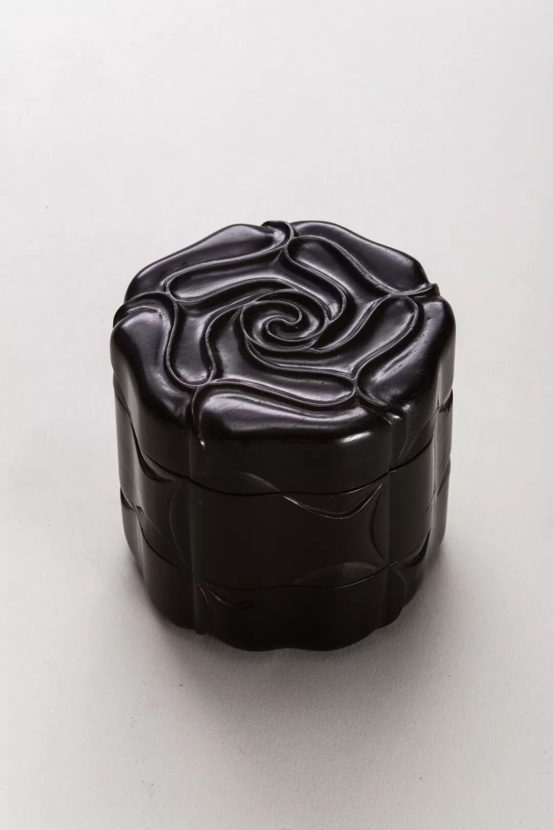 取上等紫檀木整料制成,质地坚致温润,色泽深沉静穆,包浆醇厚。外形仿葵花为式,呈五瓣葵花状,口沿五出。纹饰以陷地浮雕镌之,起棱分瓣,权衡比例,有棱有廓,凹凸分明。其弯曲回绕,观之似有旋转流动之幻象。盒内掏堂工整匀净,盒盖作子母口,亦随形以相合,盒身阴刻弧线纹饰,与棱瓣上下呼应。整器古朴清雅,精巧简约,作盛放香料或贵重物品使用,亦颇具掌玩之趣。