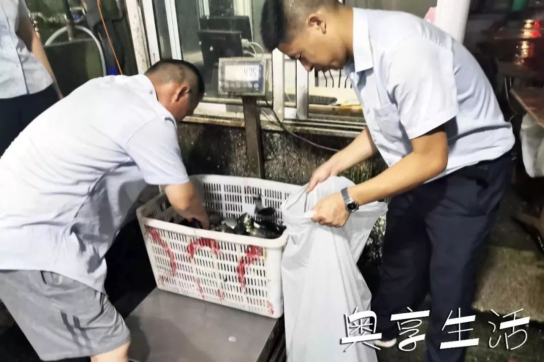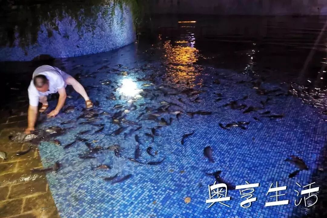 物业服务中心工作人员摸黑将鱼放入泳池中