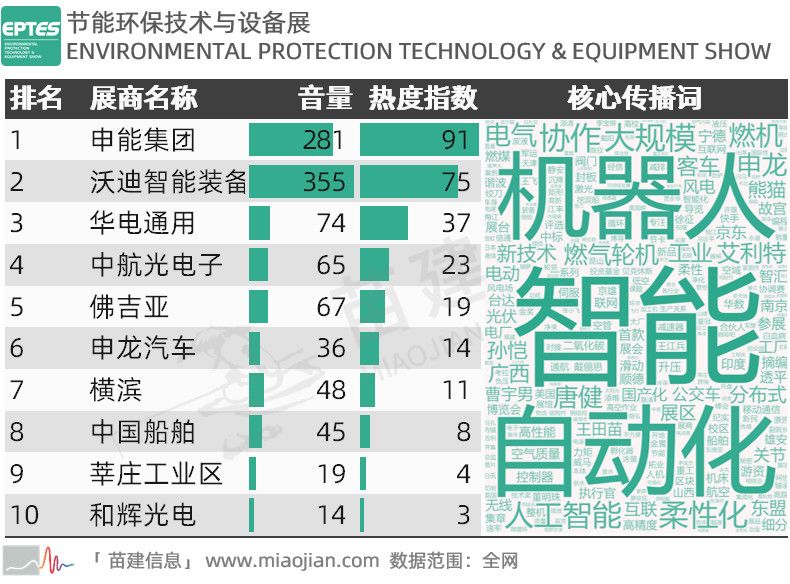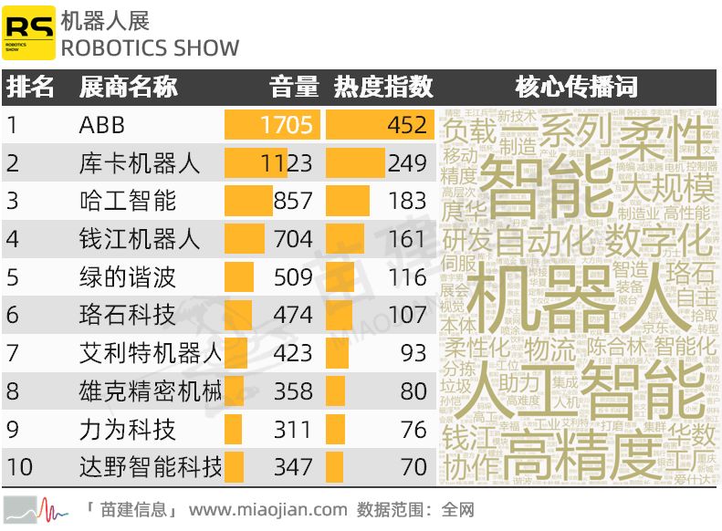 苗建信息数据团队对工博会的媒体报道进行了文本挖掘,提炼工博会的热点话题,并统计提及热词的文章数量、词频、文章提及率(提及热词的文章占总文章数的比例),用来研究媒体眼中工博会的热点概念。