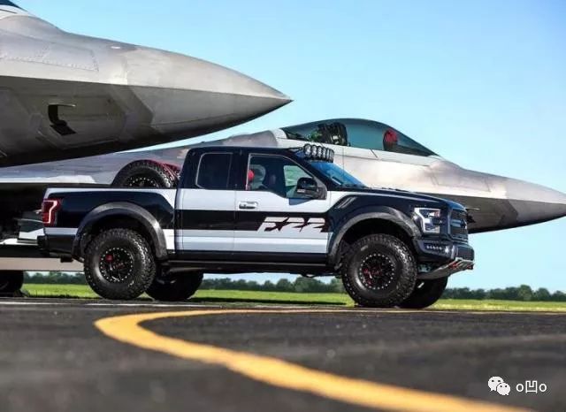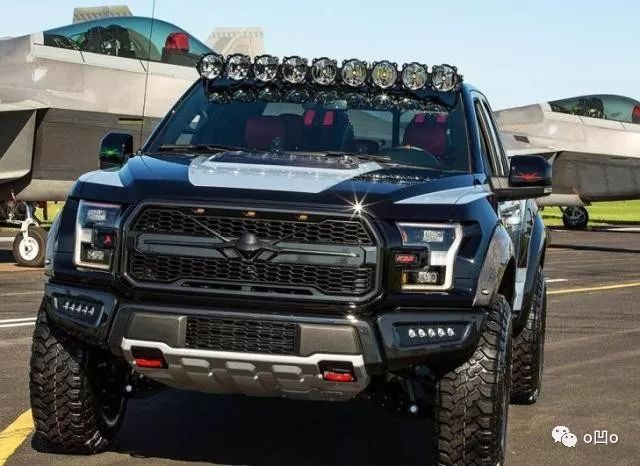 其实福特猛禽皮卡车曾经联名了f22战机,专门打造了一款f22版本的超级猛禽,这款特别版车型采用了很多战斗机设计元素。车头部分可以看到很明显的战斗机车标,替代了福特字母车标。这款特别版车型更注重越野能力,所以车头部分倾角更大,能够提供更大的接近角。侧面可以看到原厂AT越野轮胎,离地间隙相当高,车顶还加装了一排高亮度探照灯,应付一些专业的荒野越野路况也没有任何压力。