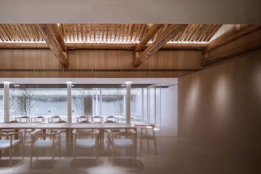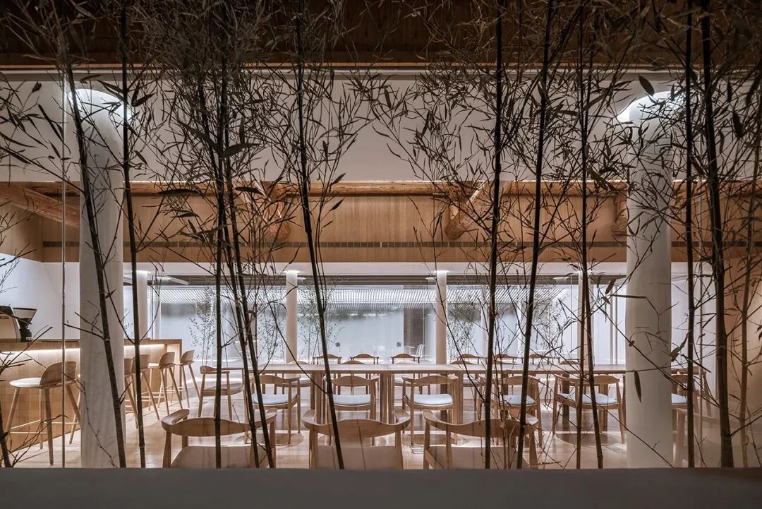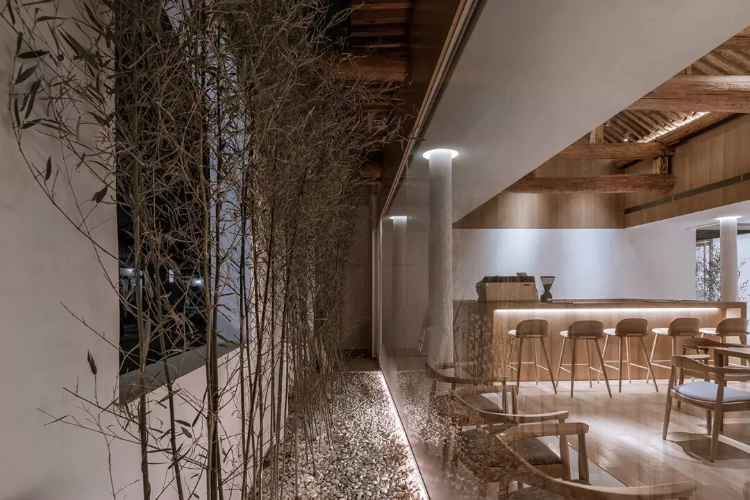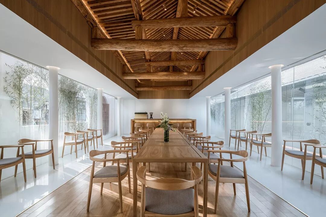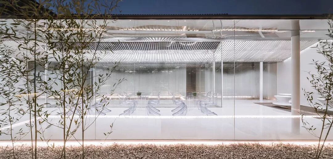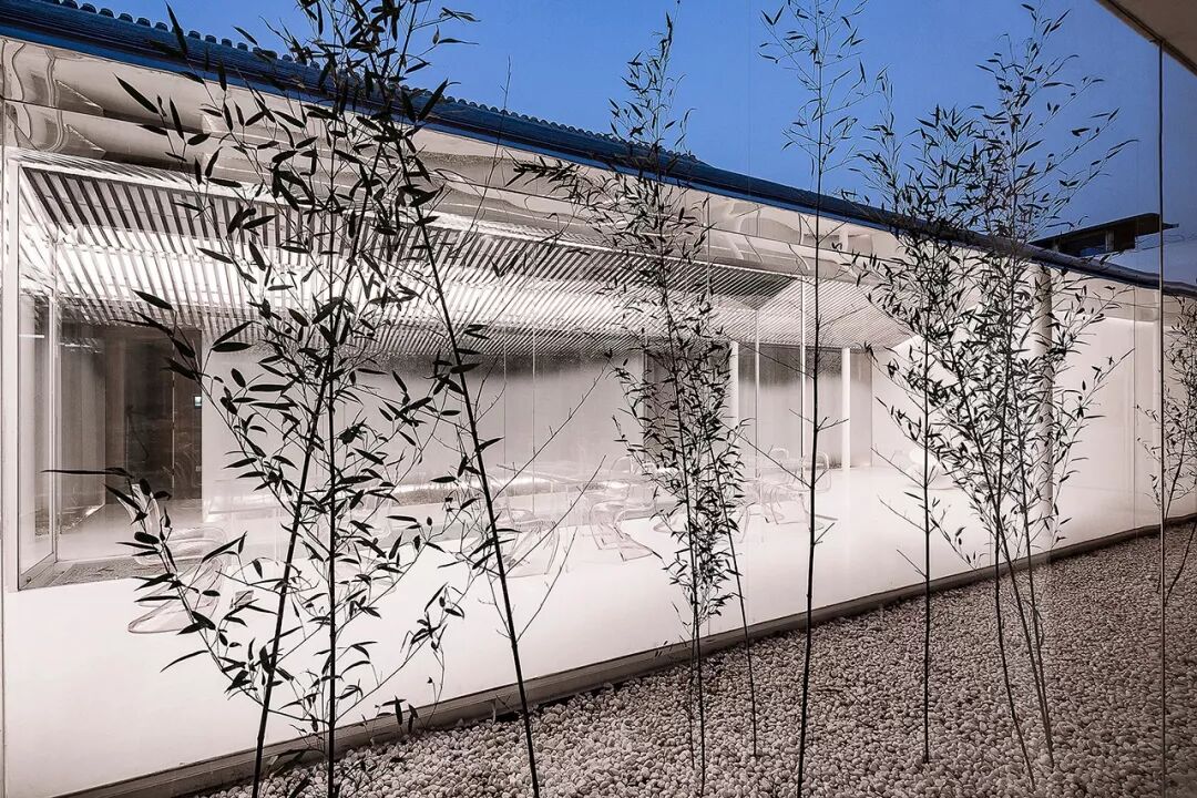 内部空间围绕一个线性的水景庭院展开,主要使用透明、半透明、反射性的材料和家具以弱化一个实体空间的物质存在感,营造有别于旧建筑的轻、透、飘的氛围,既映射又消隐于竹林庭院之中。