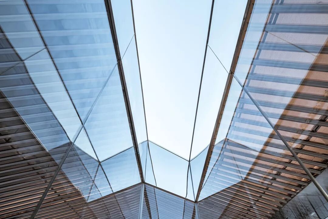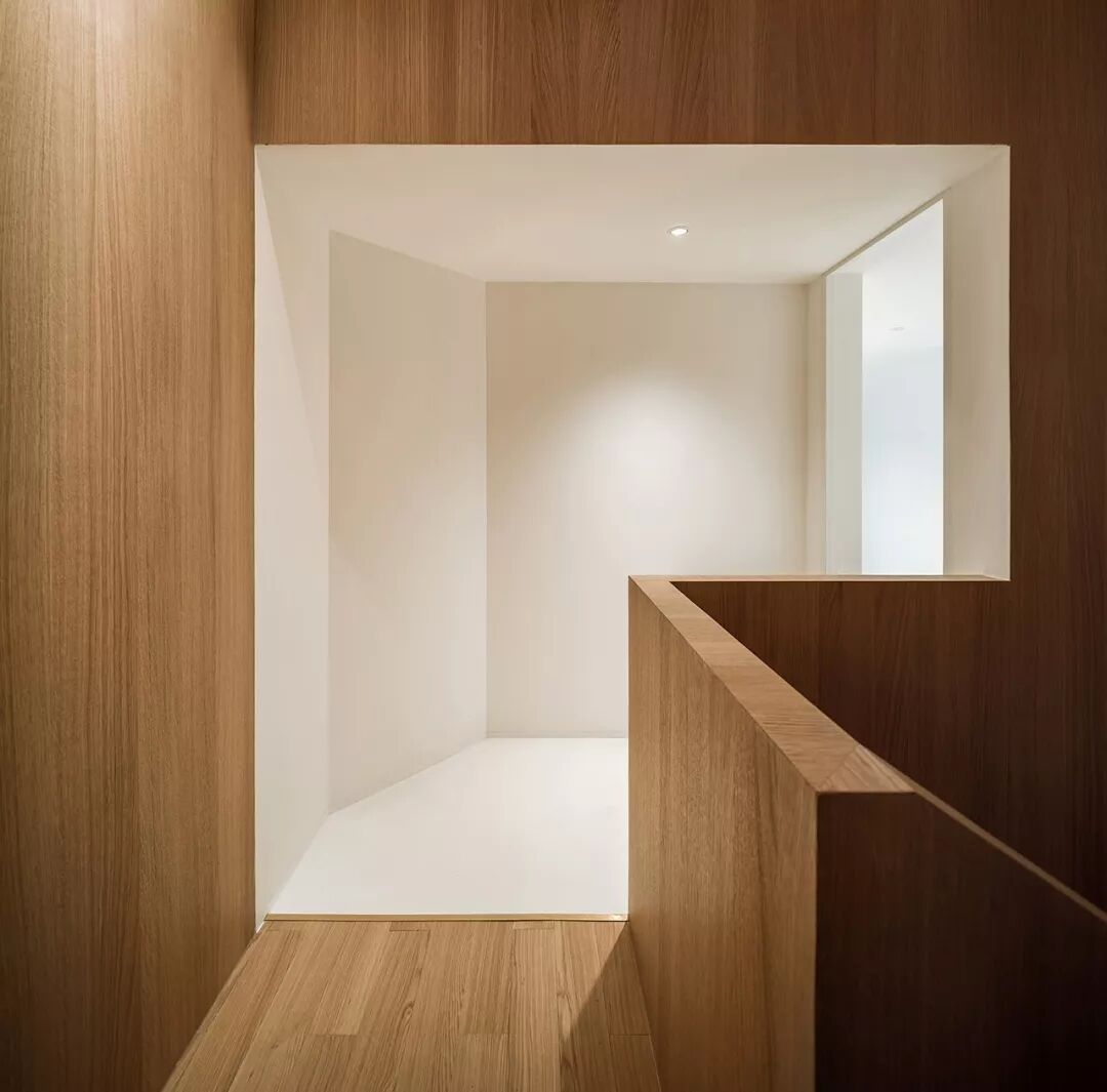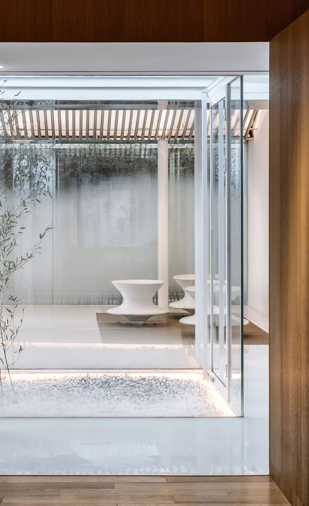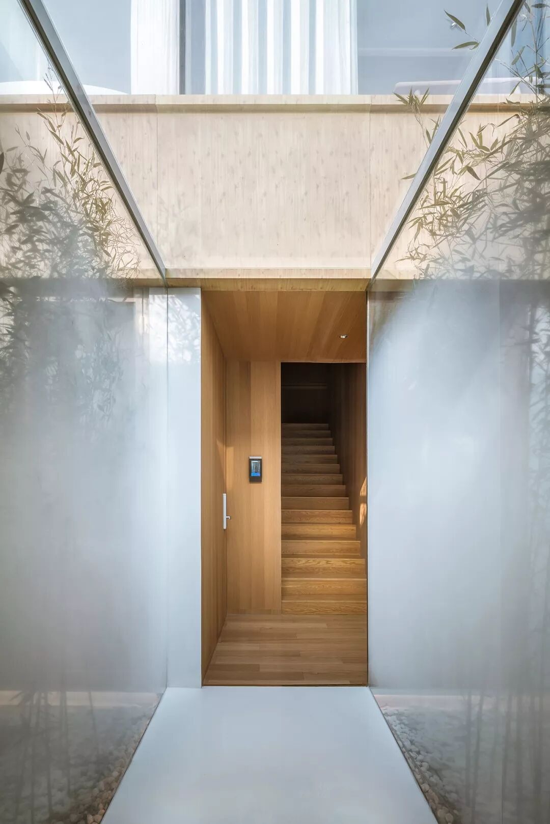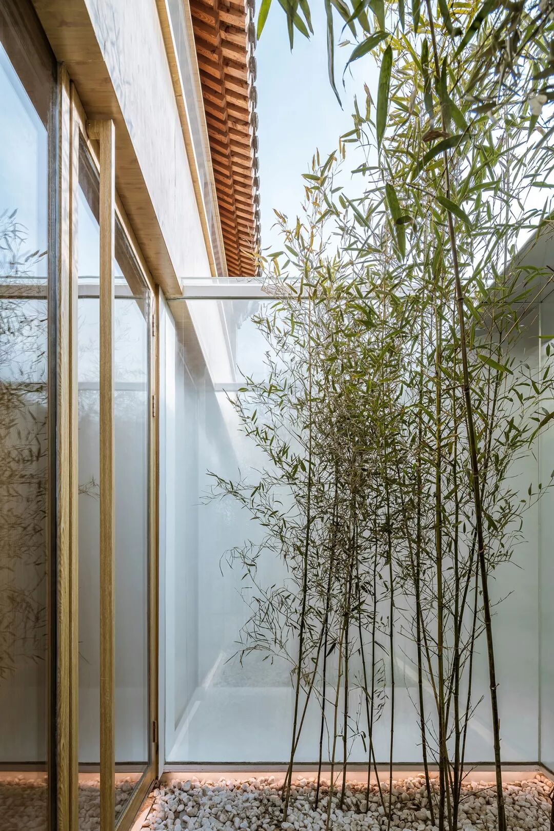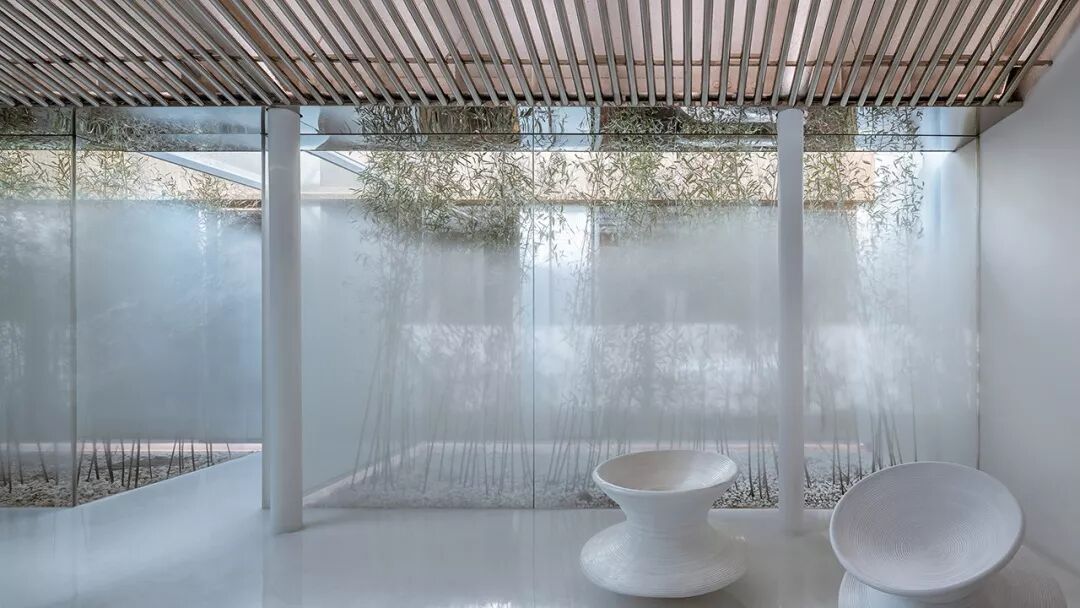 三层庭院让所有的室内空间都能有竹林与阳光相伴。空间之间彼此分离又相互透叠,带有雾化图案的玻璃墙面犹如叠嶂一般,进一步强化了半透明感的空间效果。