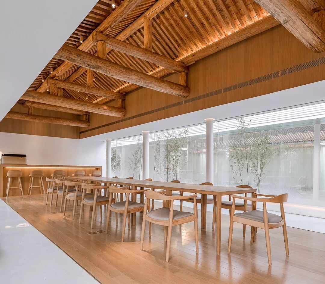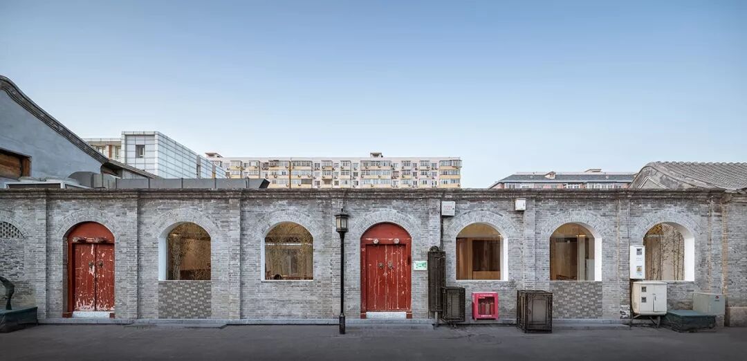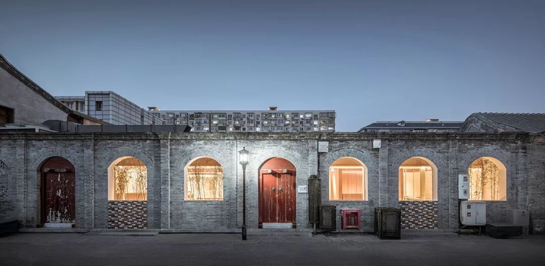 原建筑木质梁柱结构被尽量保留下来,由新置入的两个木盒子服务单元来划分出不同尺度的使用空间。透过第一层庭院,原建筑拱形门窗洞和朱漆大门变成了“影壁墙”,在竹林的映衬下勾勒出真实多彩的胡同生活剪影。