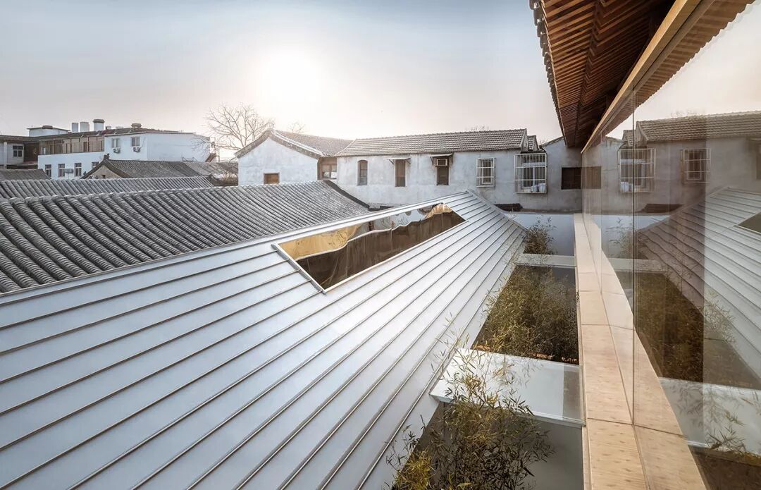 “叠院儿”重新梳理了新与旧、内与外、人工与自然的关系。首先局部拆除了南侧房屋屋顶,在室内空间与街道之间退让出第一层庭院,然后在南北房屋之间新加入一座坡顶建筑,并以两层平行的庭院将新与旧相互分隔。