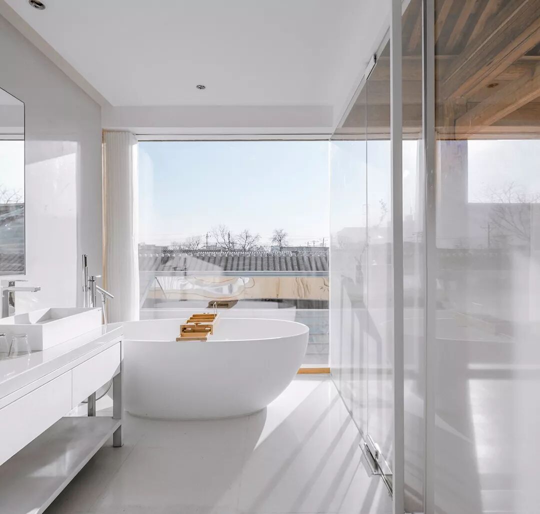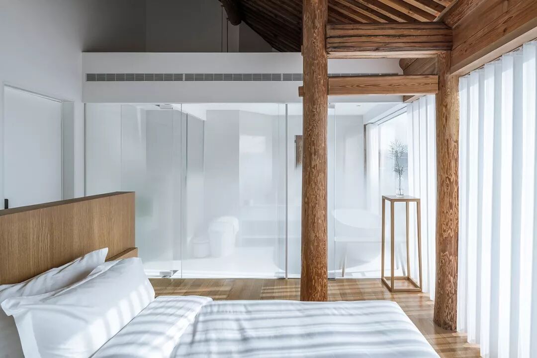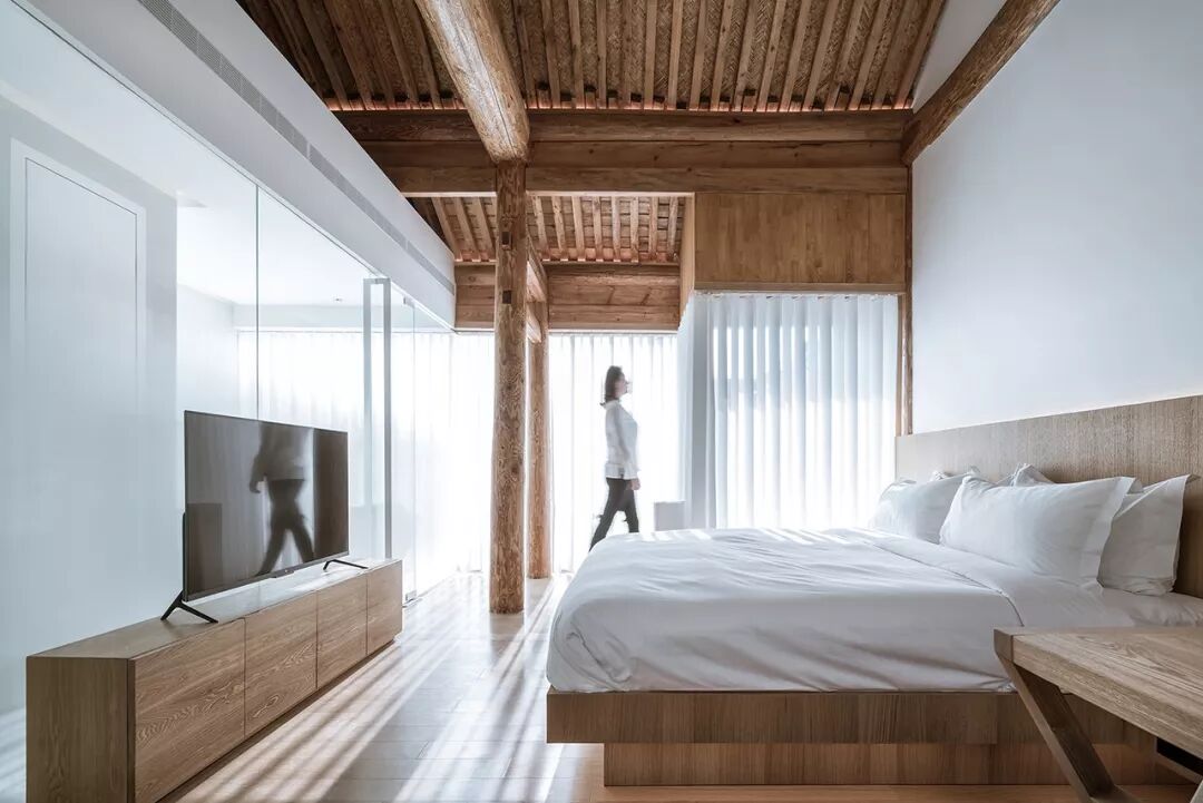 二层则分为三间大小各异的客房。透过落地玻璃幕墙,视线掠过层叠的灰瓦屋顶和绿树蓝天,正是身居此处的最佳风景。