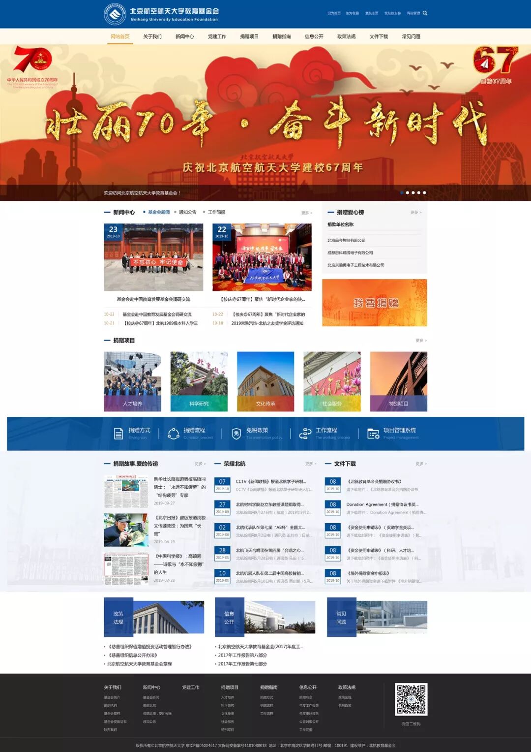 北京航空航天大学教育基金会网站是学校与广大师生、校友沟通交流以及对外宣传的重要媒介和首要窗口。值此北京航空航天大学67周年校庆之际,北京航空航天大学教育基金会网站全新改版并正式上线运行。新版网站将积极弘扬新时代主旋律,传播正能量,大力宣传党的路线方针政策,凝心聚力,坚守北航为党育人、为国育才的初心;推广北航特色捐赠项目,传承北航人精神力量,共同构建北航优秀捐赠文化;积极推进捐赠信息公开。