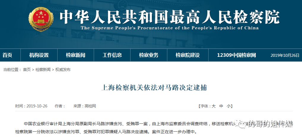 据高检网,中国农业银行(3.660, 0.01, 0.27%)审计局上海分局原副局长马路涉嫌贪污、受贿罪一案,由上海市监察委员会调查终结,移送检察机关审查起诉。日前,上海市人民检察院第一分院依法以涉嫌贪污罪、受贿罪对犯罪嫌疑人马路决定逮捕。案件正在进一步办理中。