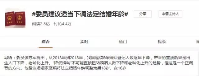 6月草案二审稿审议时,曾有全国人大常委会委员建议将法定婚龄调整为18岁和16岁。随着我国适龄青年结婚率降低,人口老龄化问题突显,调整婚龄适时提上日程。
