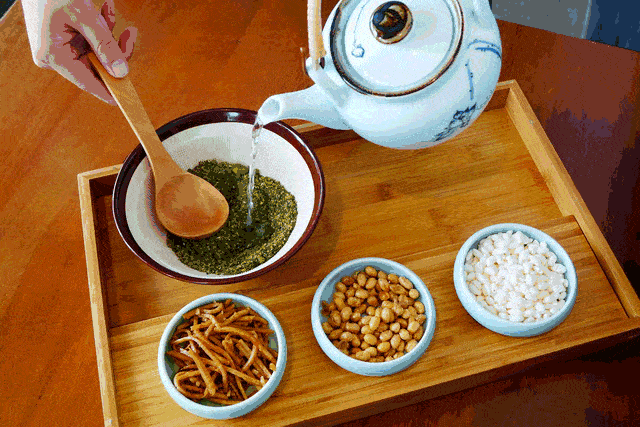 擂茶的功能颇多,尤其适合酒足饭饱之后喝口擂茶,油腻尽退,满腹舒畅。这无疑是田垄湘又一笔上乘之作。
