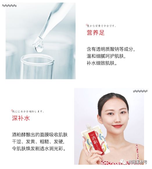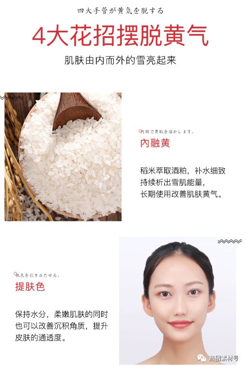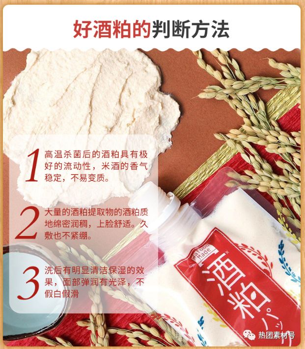 在日本,酿制日本酒首先酿制发酵液,压榨发酵液就得到酒粕,酒粕中的酵母在经过发酵后会产生氨基酸、抗氧化基、阿魏酸、微酸性物质、酒精等,可以加速表皮细胞代谢,加速微血管循环,抗氧化,还具有一定的保湿功效~