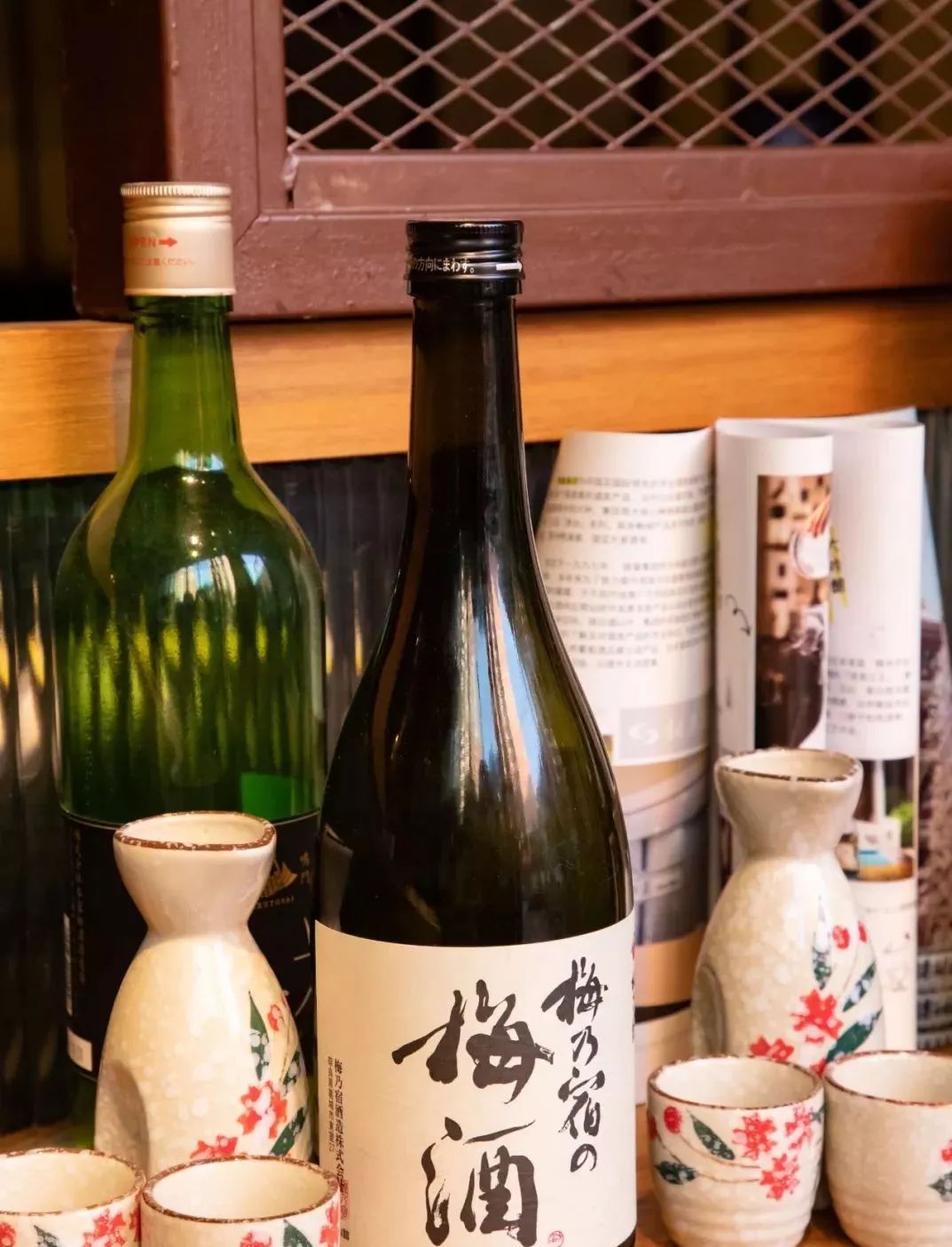 入门就能梅酒和印有花纹酒壶杯和插麦穗的酒钢