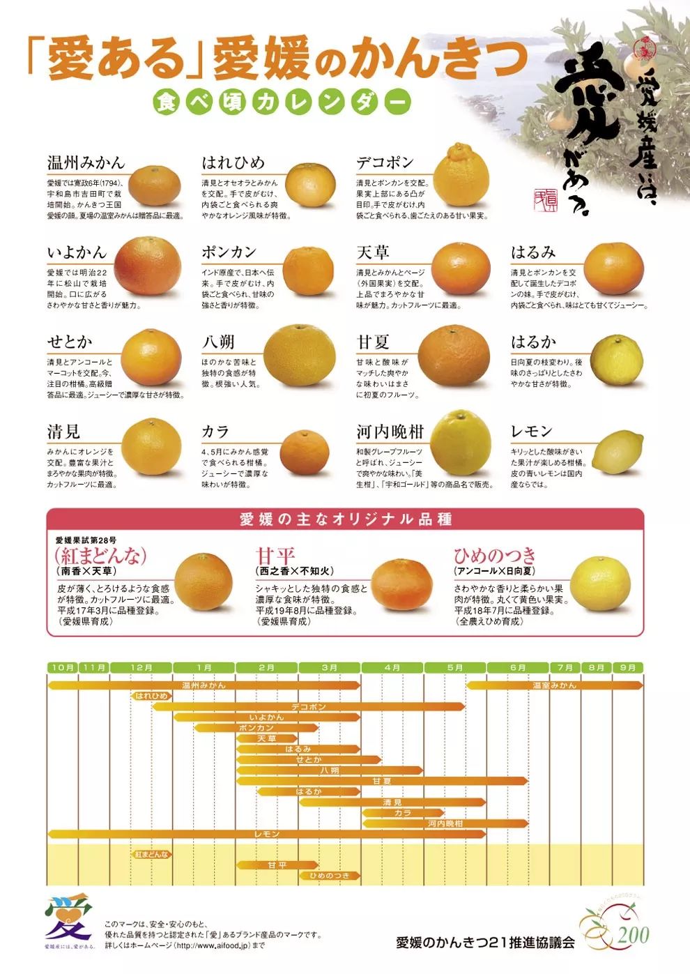 再补充一点爱媛县的知识,爱媛县柑橘年产量约为21万吨。拥有100多年的历史,在柑橘产业方面有很多研究,培育出了很多精品柑橘品种。下图为爱媛县的一些品种: