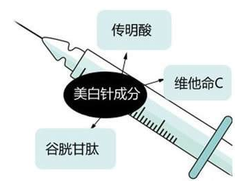 我们常说的美白针,主要成分就是谷胱甘肽、传明酸、维C,通过抑制细胞氧化,阻止黑色素生成,达到促进新陈代谢,减弱和祛除色斑,让全身变白的作用。