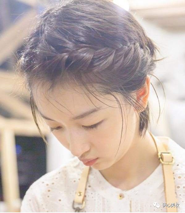 说起短发那就必定要提名周冬雨,短发编发比起长发编发的优势不是一星半点,短发编发会更具有少女的活泼感,采用二八分的分界,在发际线的脸边编发,最后两股在脑后交叉,让剩下的碎发随意散落,少女的乖巧感立马就跳出了。