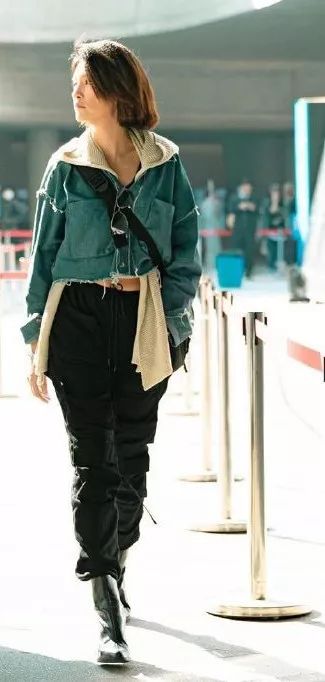 下面的小姐姐也是选择了用外套来保暖,不过正值中午的时候,外套已经脱下拿在手里,他选择的是一件西装外套,黑色跟蓝色拼接的外套,让造型可以更时尚不少了,里面则是选择了一身白色的搭配,上面是一件白色的卫衣,卫衣上只有简单的logo设计,让造型不会过于单调了,下面的裤子同样是选择了白色,不过在腰间的位置上设计了黑色的腰带,可以让造型的腰线可以更明显几分,脚上的鞋子选择了蛇纹的靴子,给整个白色的造型增加了一分色彩,让造型更多元化。
